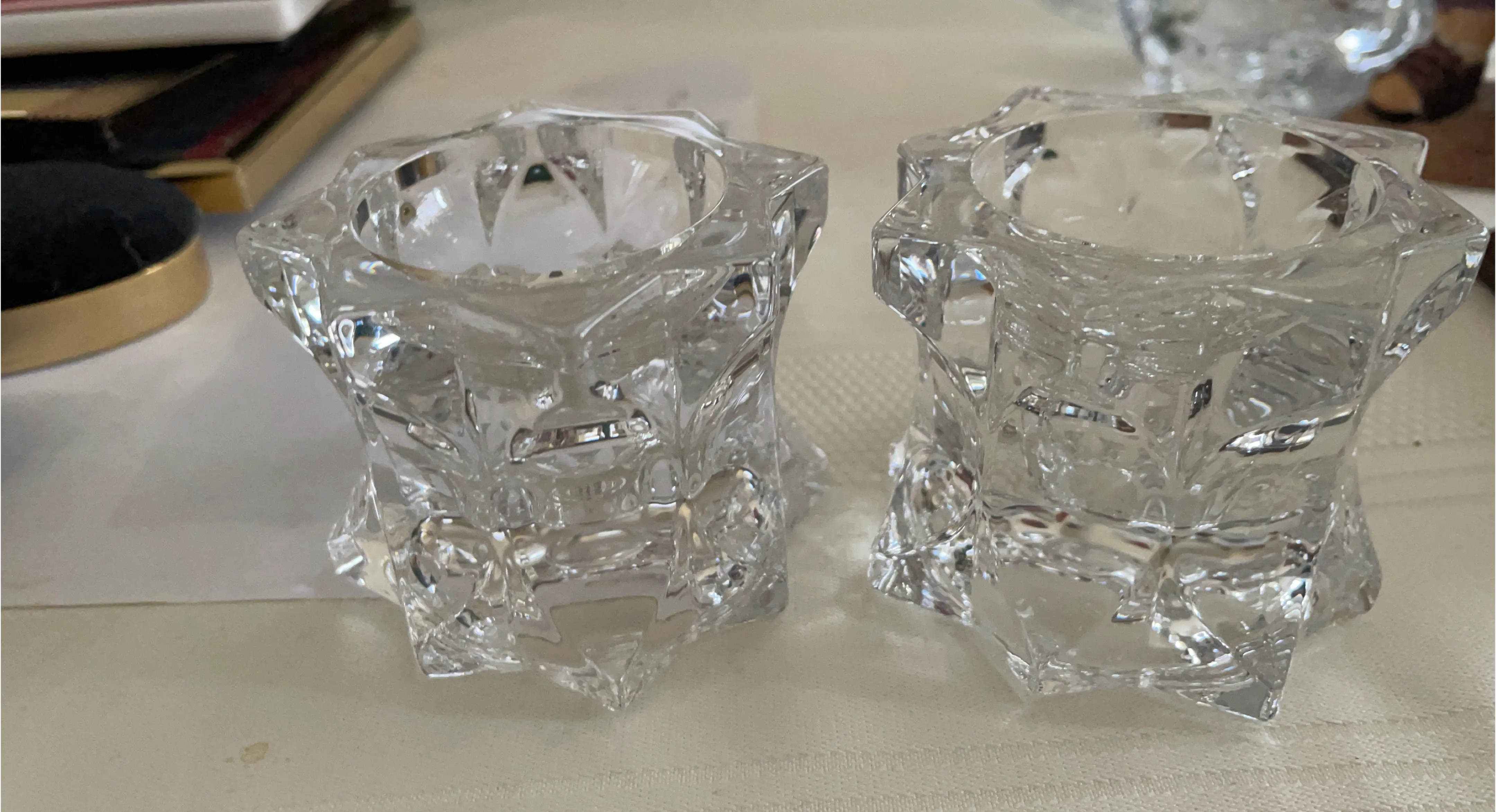 These two clear glass votive candle holders have a faceted, geometric design. They're made of glass. They can hold tealights or votive candles.