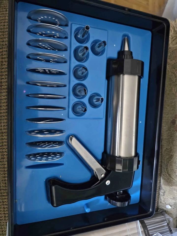 Awesome cookie press set. Has a stainless steel cookie press gun. Comes with lots of cookie discs and decorating tips. All in its own storage case.