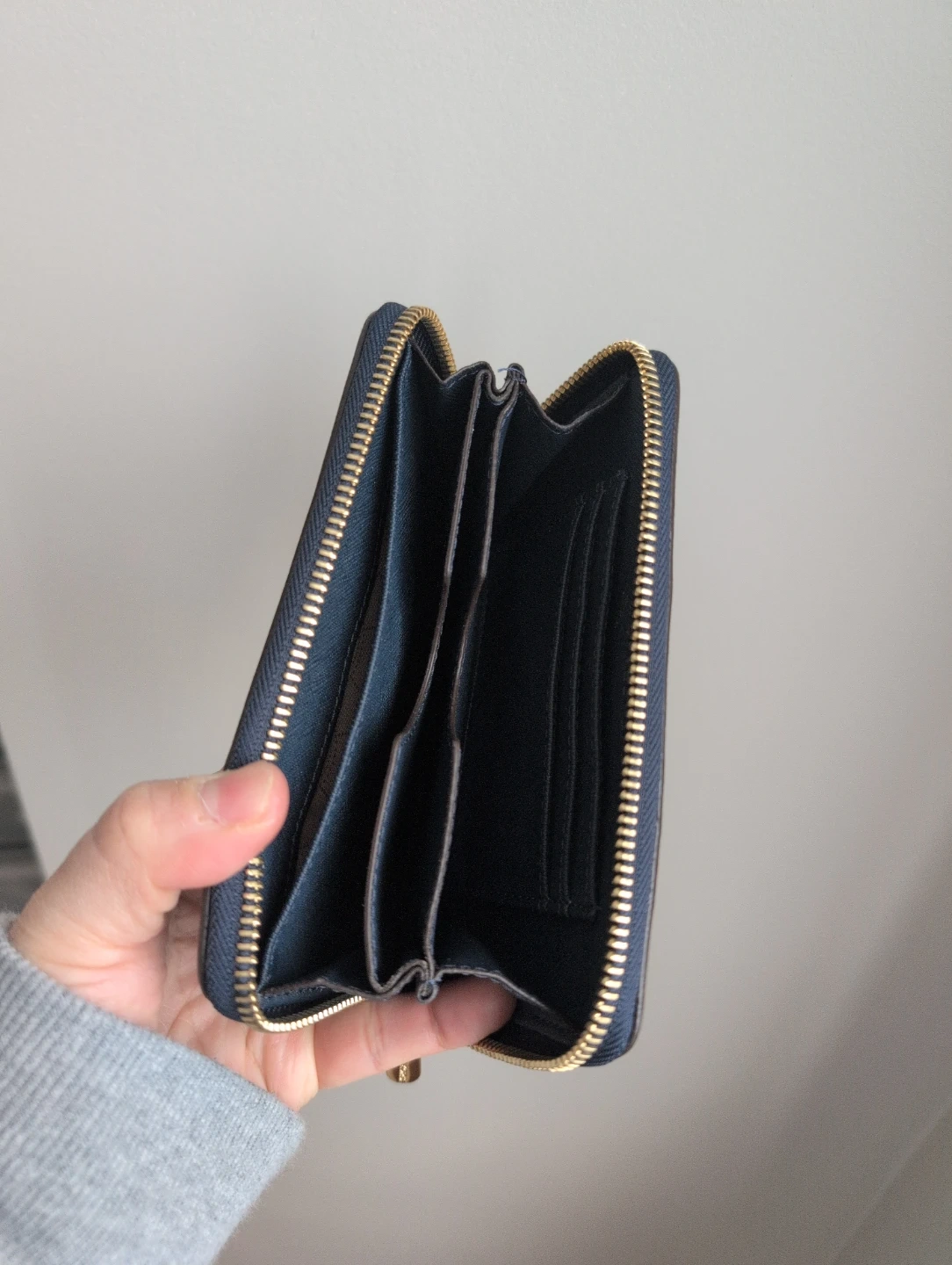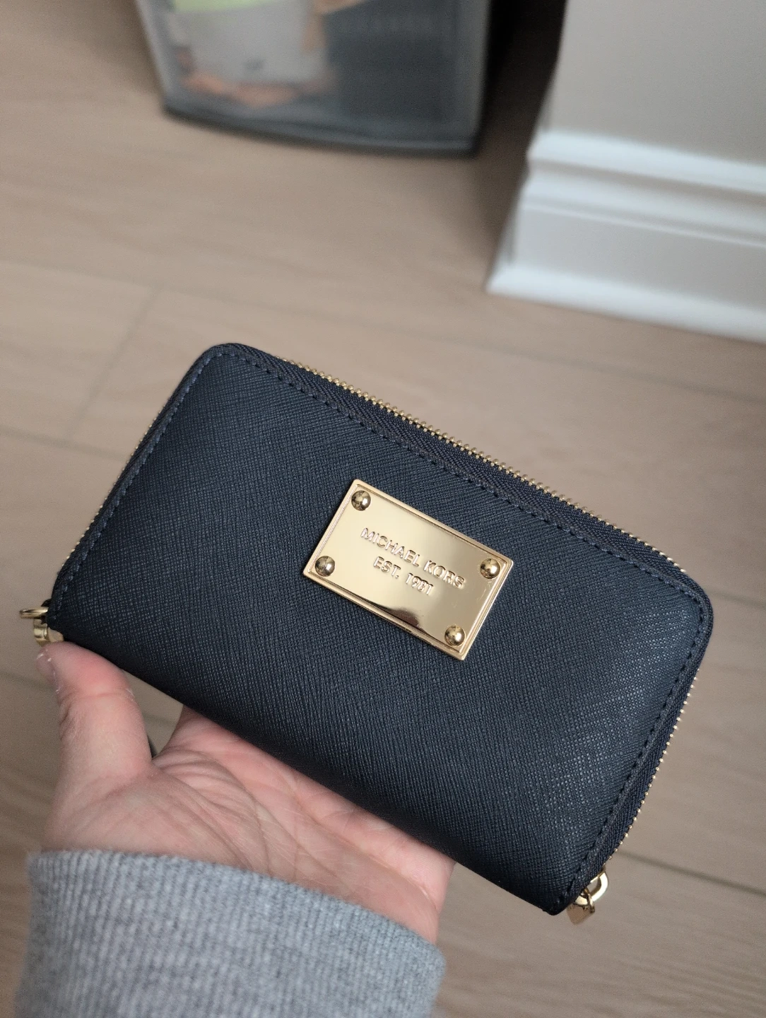 Navy Michael Kors wristlet wallet with gold hardware. It has multiple card slots and a zip-around closure. Wrist strap included.