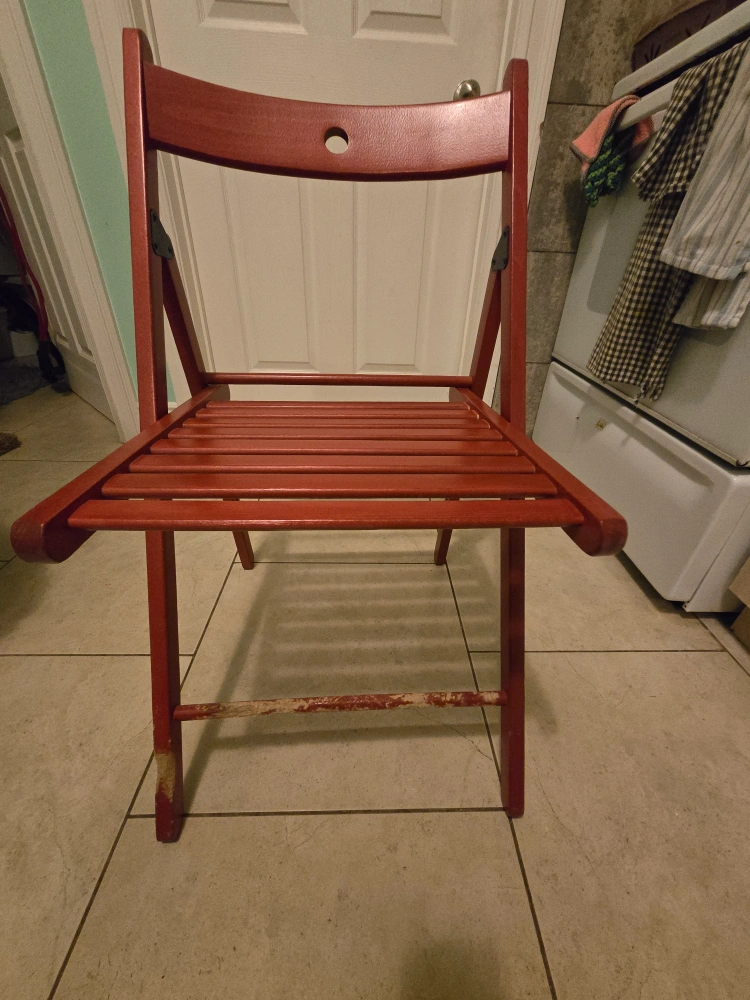 Two reddish-brown folding wooden chairs. Simple design, slatted seat. Tops/ seats in excellent condition, substantial wear visible near the bottom (see pics). Asking $15 each or 25 for both.