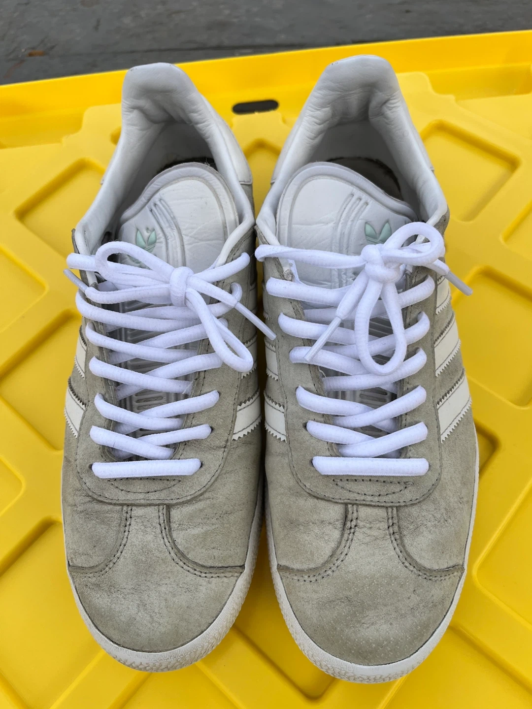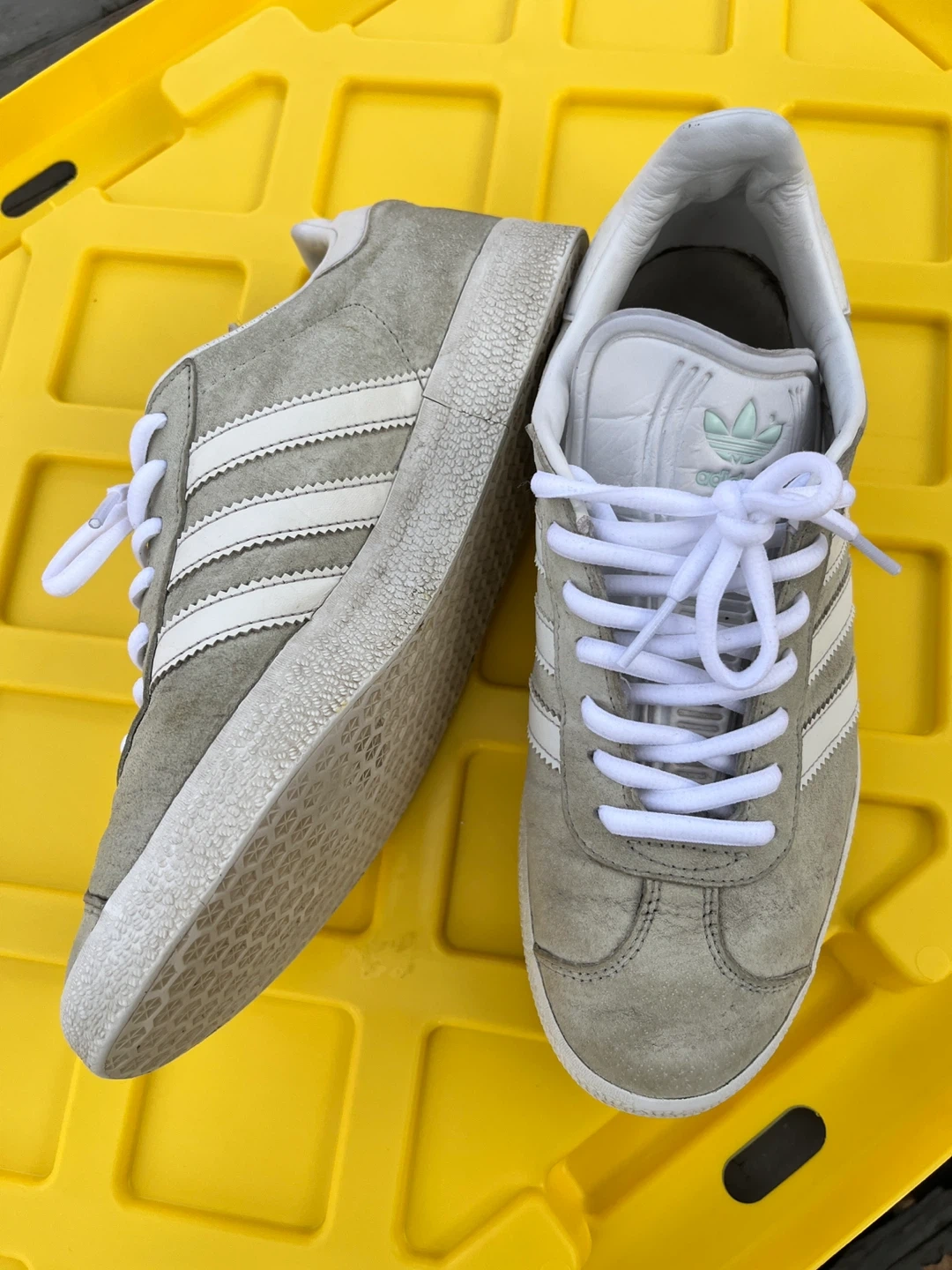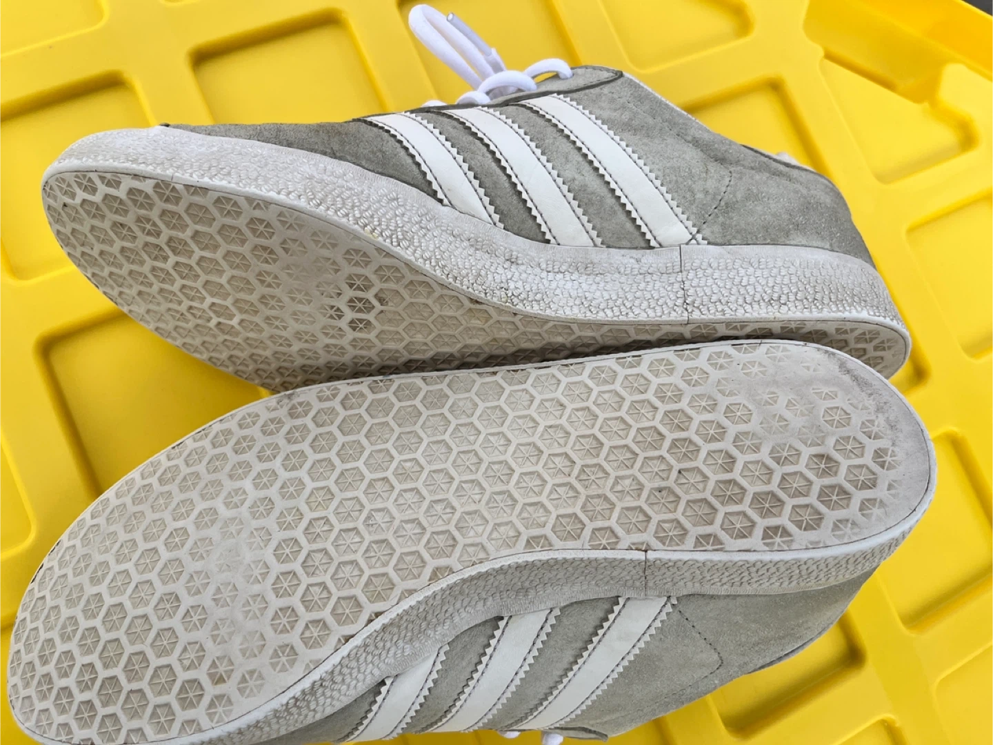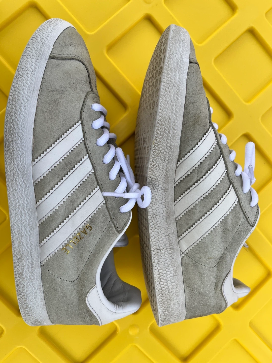 Adidas Gazelle sneakers in grey with white stripes. Suede upper and rubber sole. Shows some signs of wear.