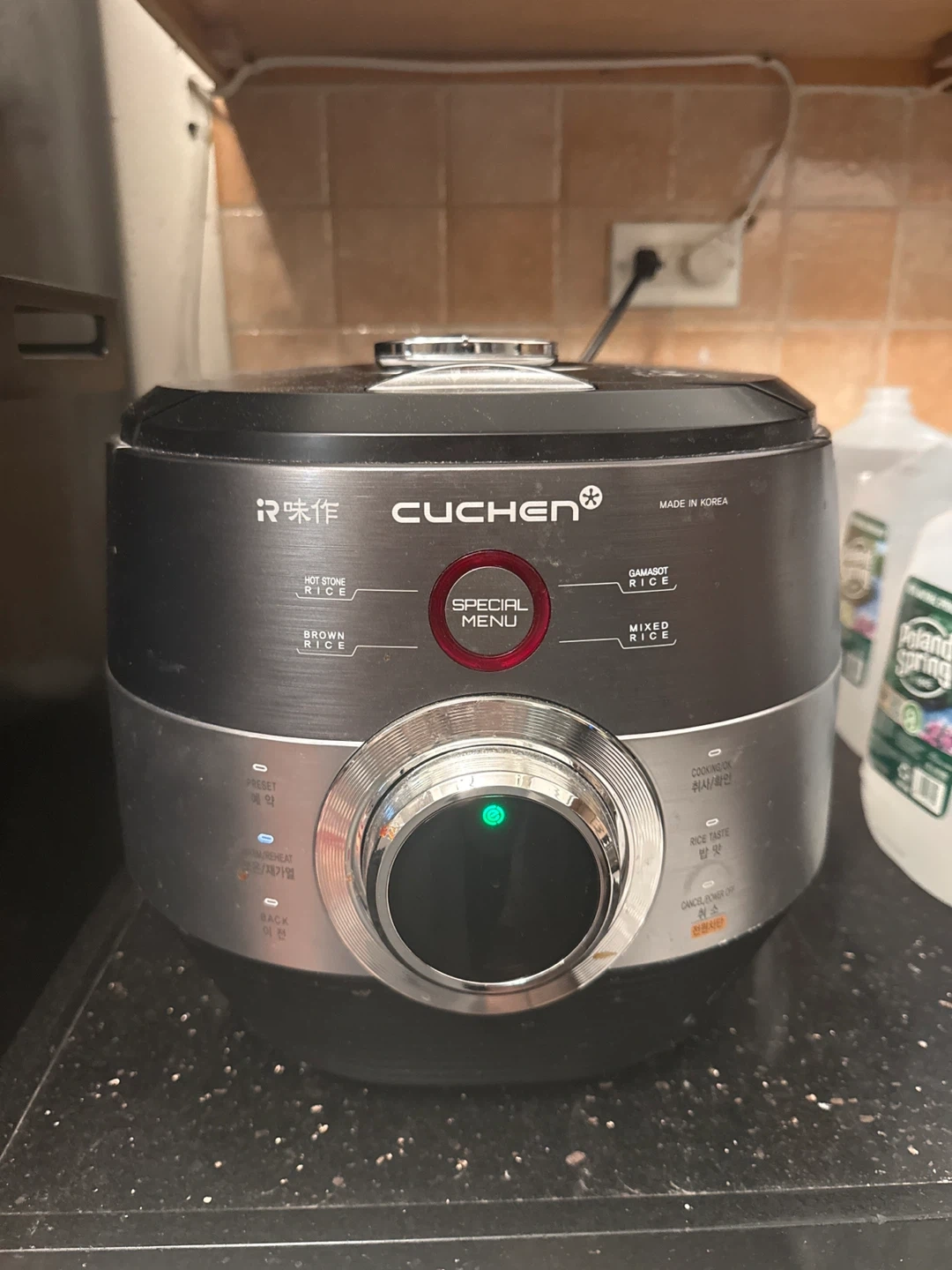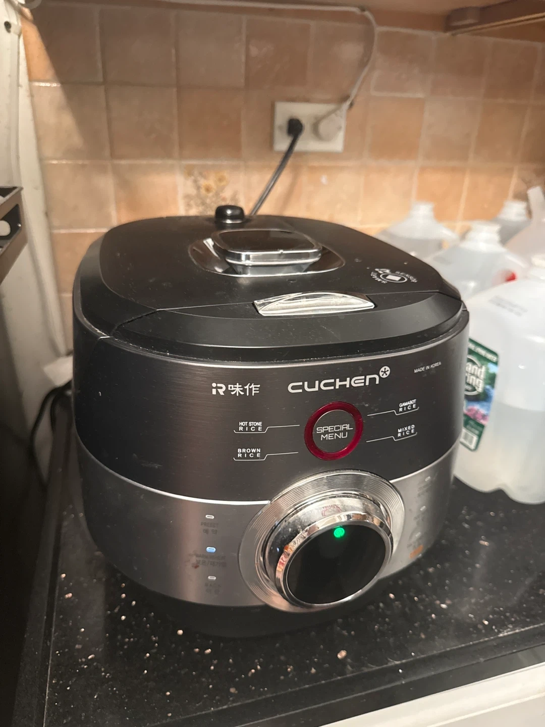 This Cuchen electric rice cooker is great for making various types of rice. It has settings for hot stone rice, brown rice, and mixed rice. It's made in Korea.