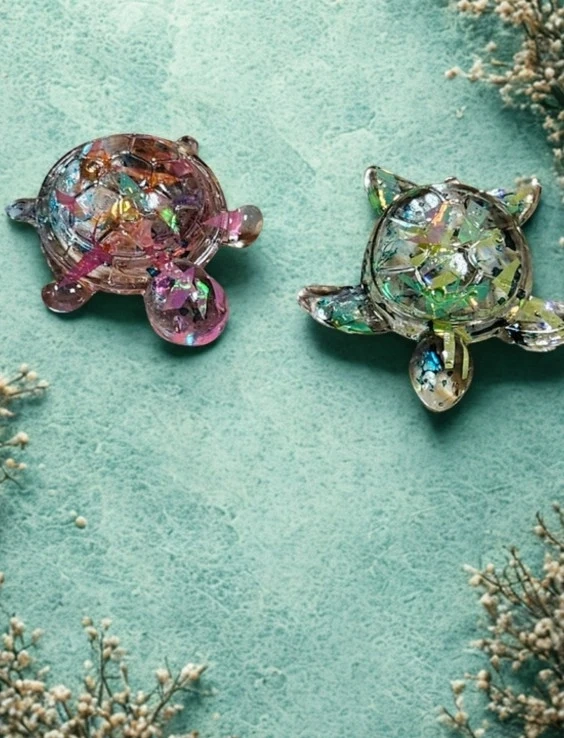 Lot de deux adorables petites tortues faites de résine scintillante. Parfaites pour décorer une étagère ou un bureau. Elles apportent une touche de couleur et de fantaisie à n'importe quel espace.