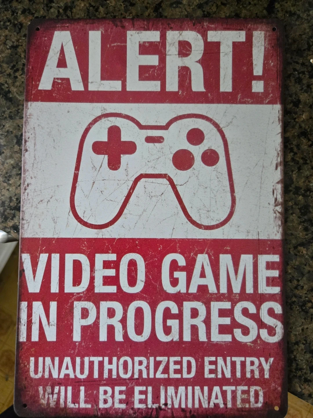 ALERT! This sign lets everyone know a video game is in progress. Unauthorized entry will be eliminated! It's a fun way to declare your gaming zone off-limits. Metal sign.