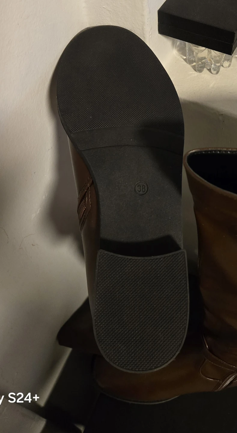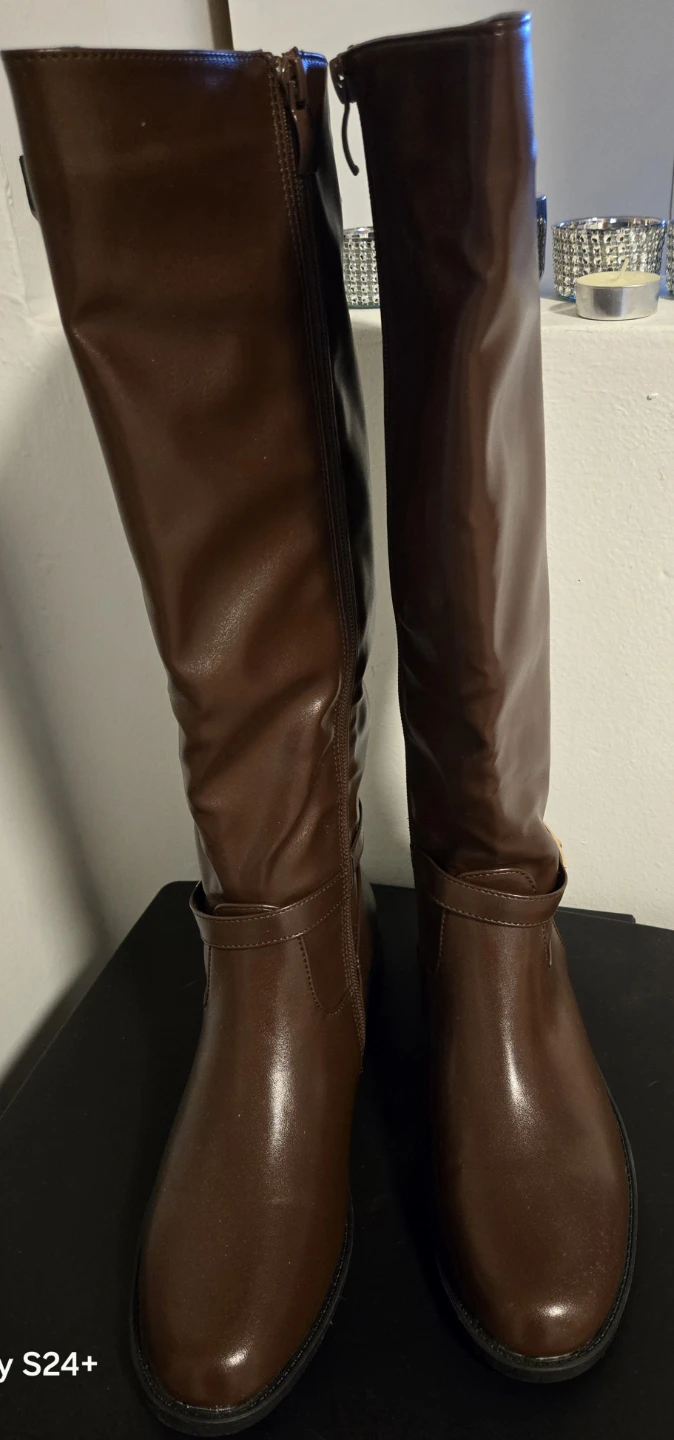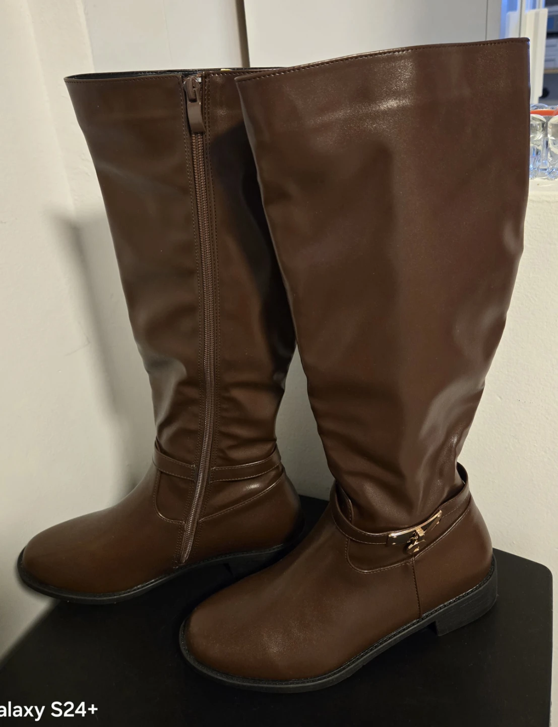 Stylish brown knee-high boots. These boots are made from faux leather and feature a side zipper for easy wear. A decorative buckle accent adds a nice touch. They're great for completing your fall and win. Summer, winter, fall spring outfits! I paid $220 at the Bay