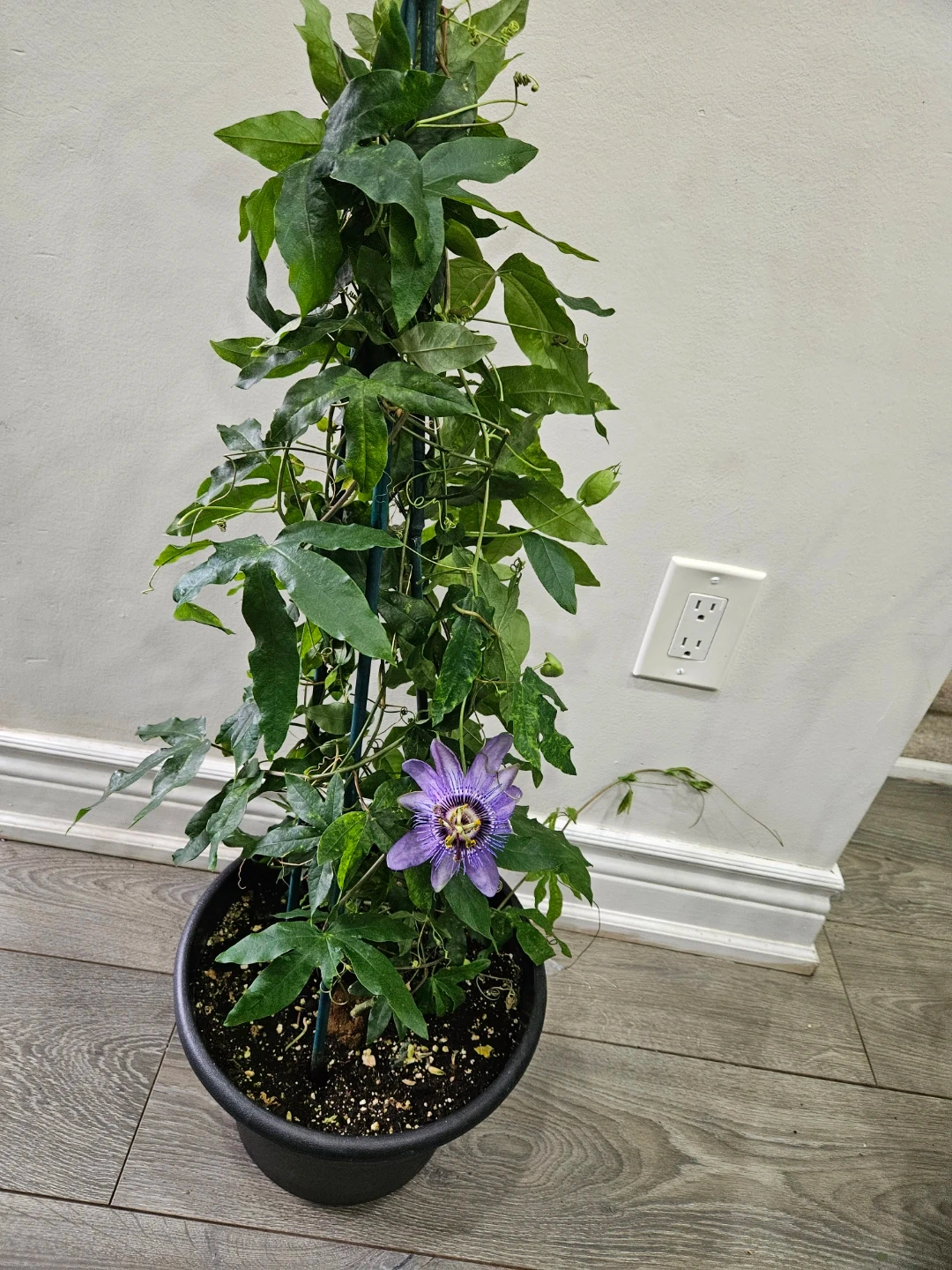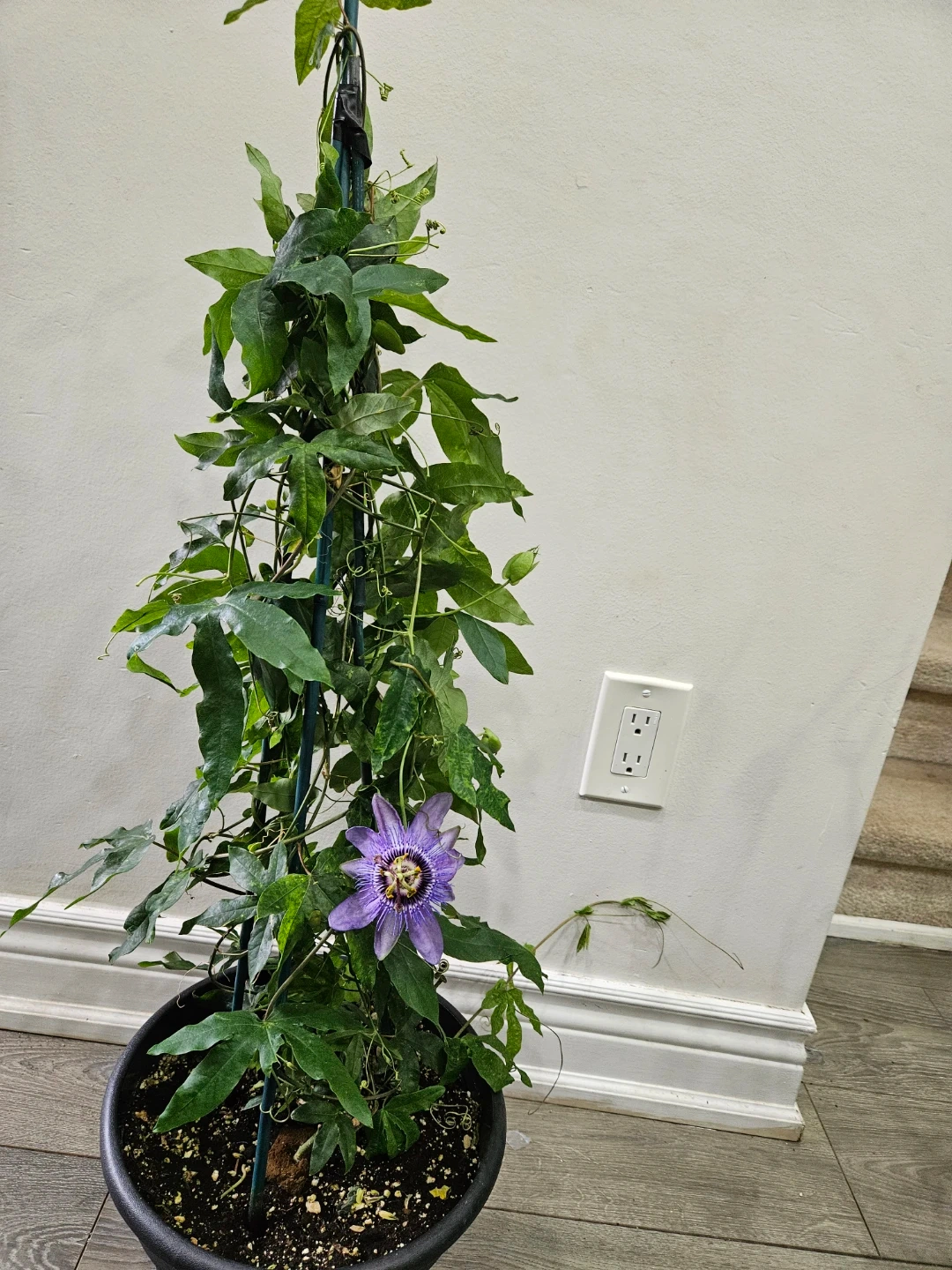 A beautiful live passion flower plant with a vibrant purple bloom. It's growing vigorously on a support stake in a black pot. Ready to add some unique beauty to your space!