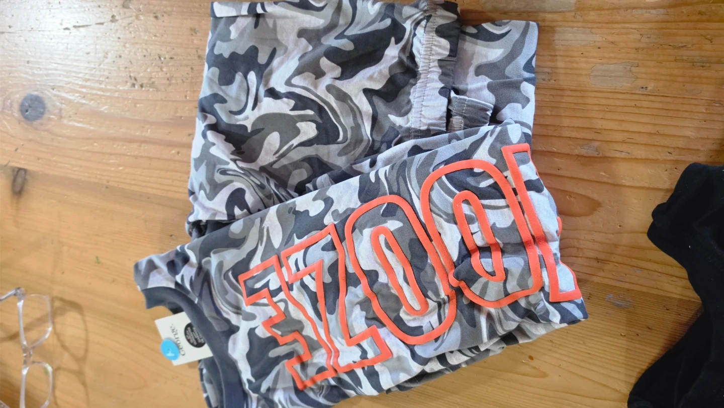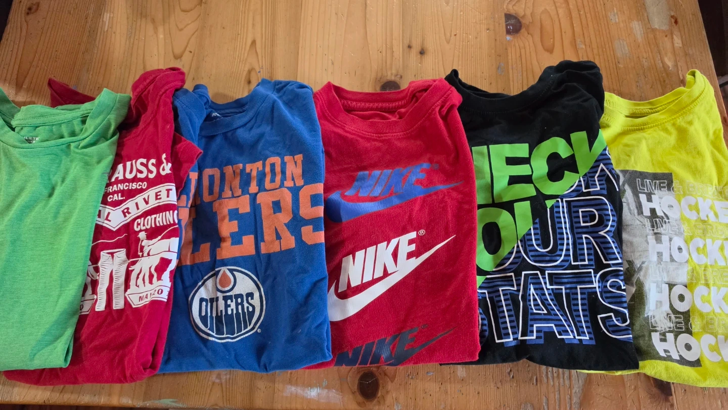 Bundle of 6 kids t-shirts including Nike, Edmonton Oilers, and other graphic tees. Also includes a pair of black Reebok track pants and camouflage print brand new set if PJs