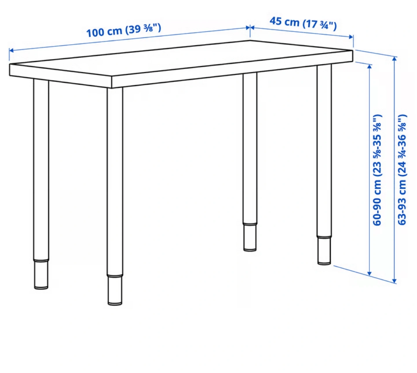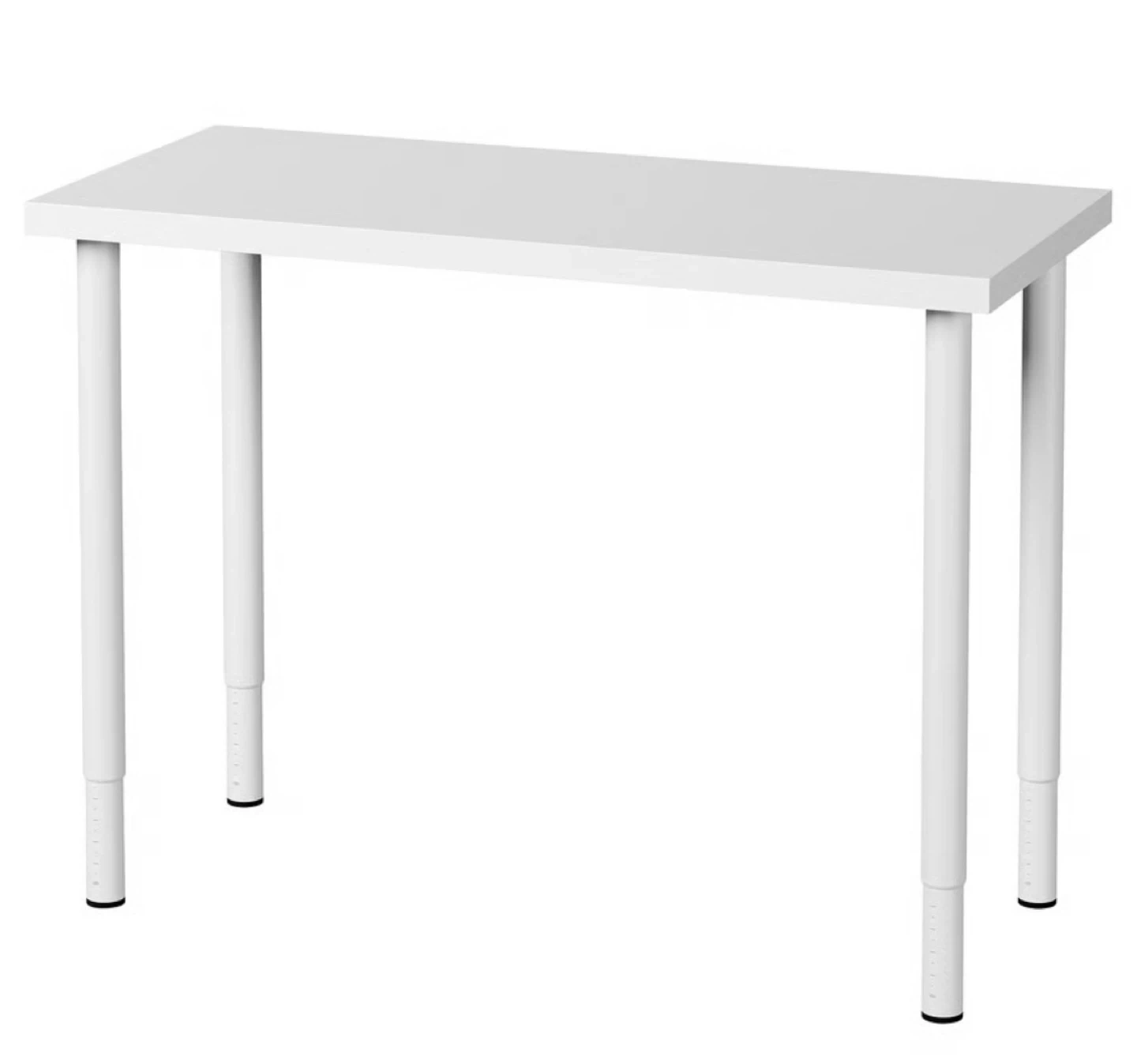 Selling a simple white desk that's perfect for a home office or study space! It measures 100 cm (39 3/8") in length and 45 cm (17 3/4") in width. The height is adjustable from 60-90 cm (23 5/8 - 35 3/8").