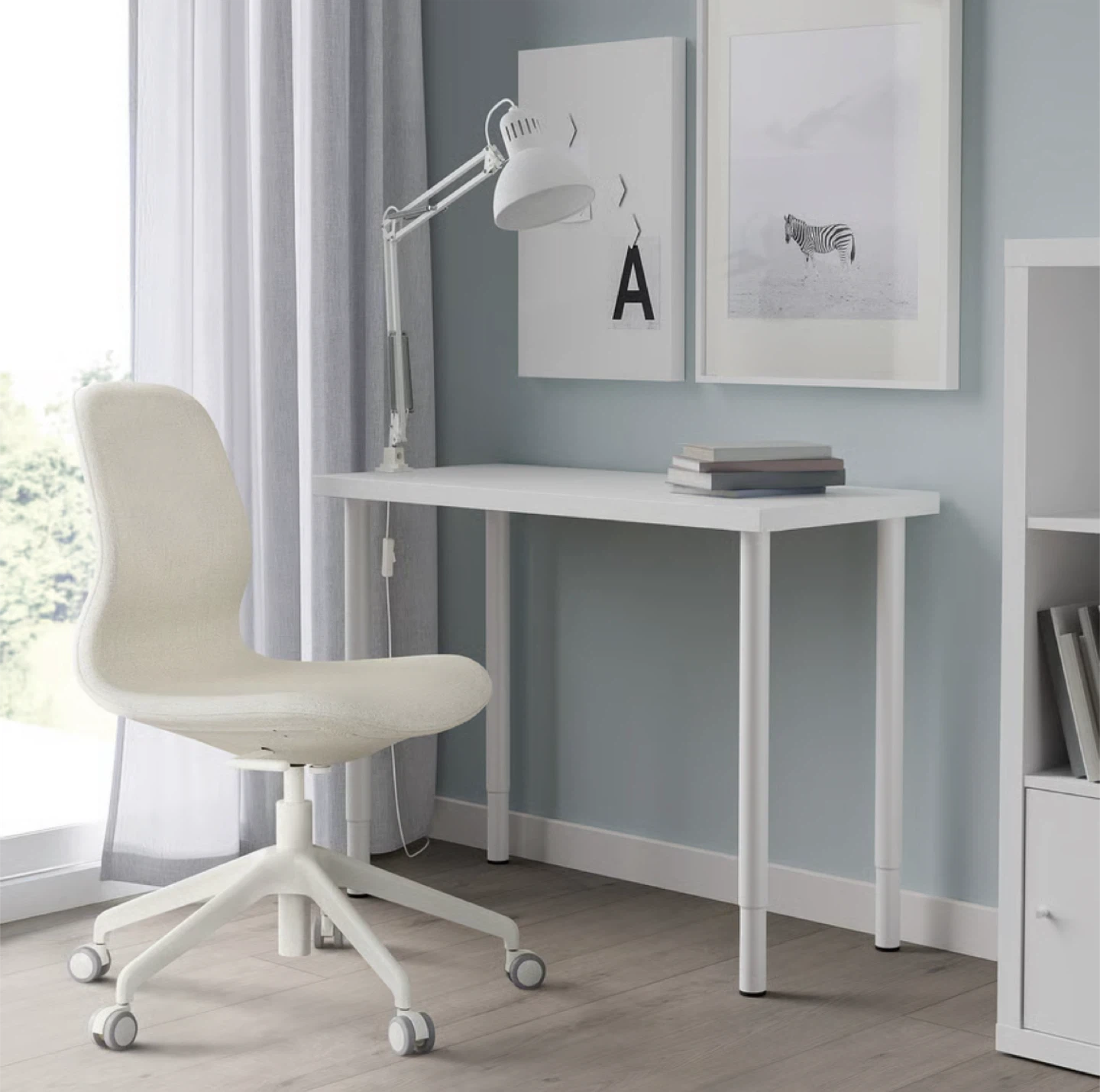 Selling a simple white desk that's perfect for a home office or study space! It measures 100 cm (39 3/8") in length and 45 cm (17 3/4") in width. The height is adjustable from 60-90 cm (23 5/8 - 35 3/8").