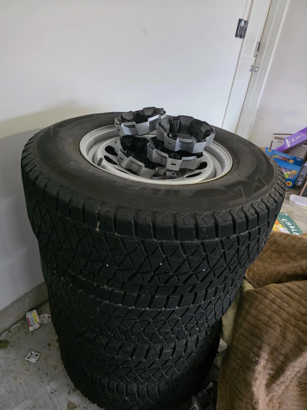 Selling a set of four winter tires, suitable for trucks or vans. Also included are four grey plastic hubcaps. Tires are black and show good tread. Hubcaps are decorative plastic pieces. Also tires are on rims. Bridgestone Blizzard tires 265/70R17 115R
