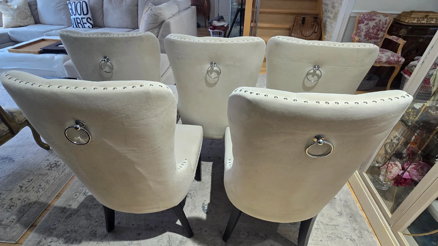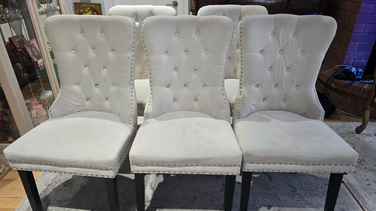 Selling 6 tifted dining chairs in good USED condition. These are not new so please look at the pictures. They have some darkening of the fabric due to use.