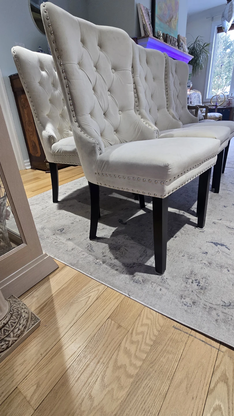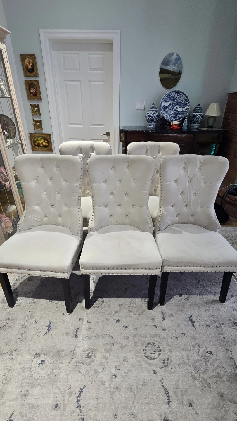 Selling 6 tifted dining chairs in good USED condition. These are not new so please look at the pictures. They have some darkening of the fabric due to use.