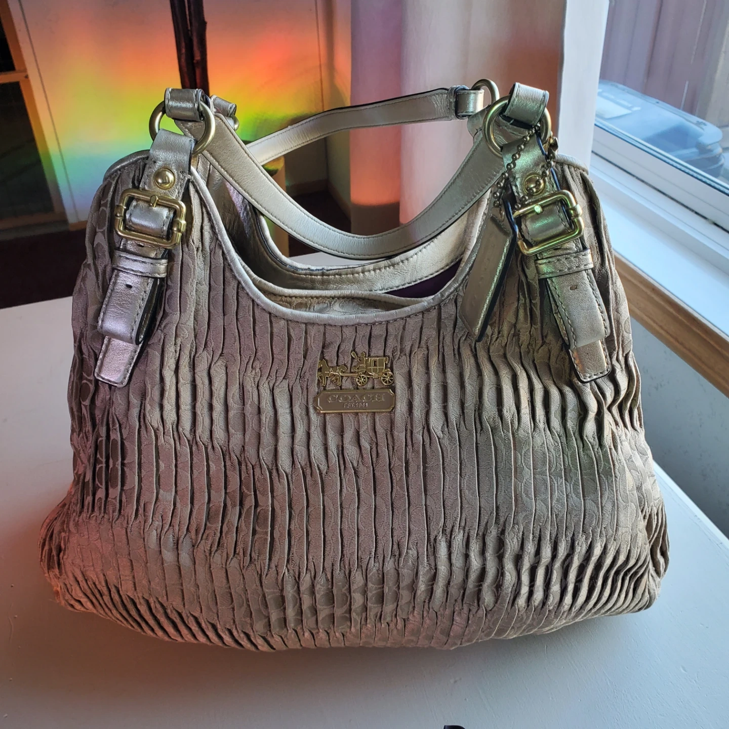 A stylish Coach hobo handbag made from ruched fabric. It features a magnetic snap closure and a zippered interior compartment. Includes a Coach dust bag for storage. Perfect for everyday use!