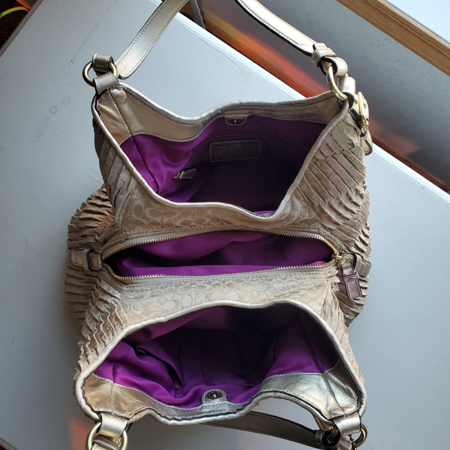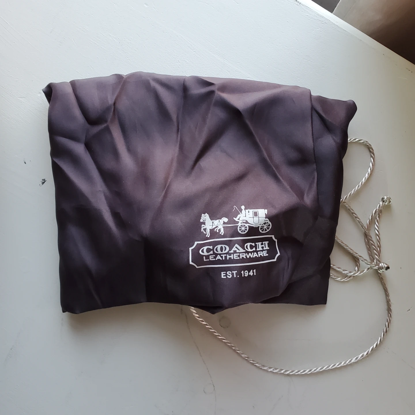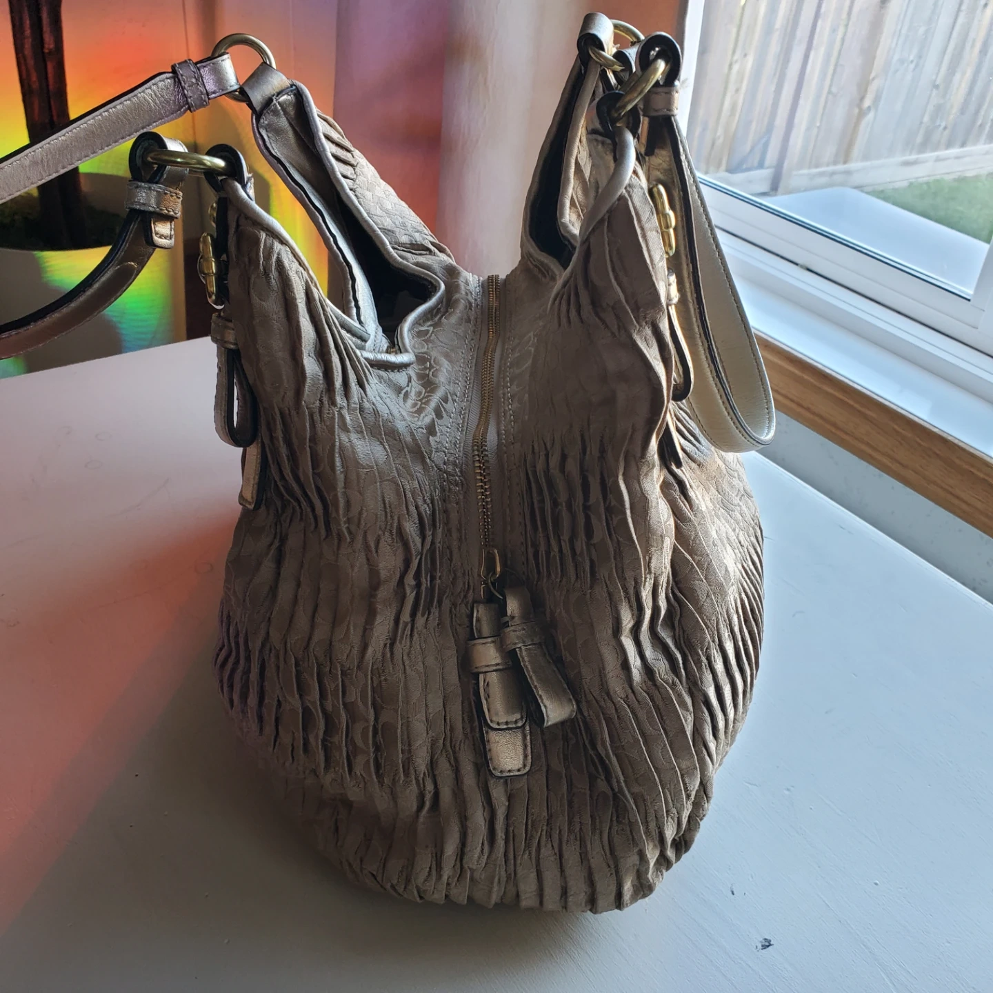A stylish Coach hobo handbag made from ruched fabric. It features a magnetic snap closure and a zippered interior compartment. Includes a Coach dust bag for storage. Perfect for everyday use!