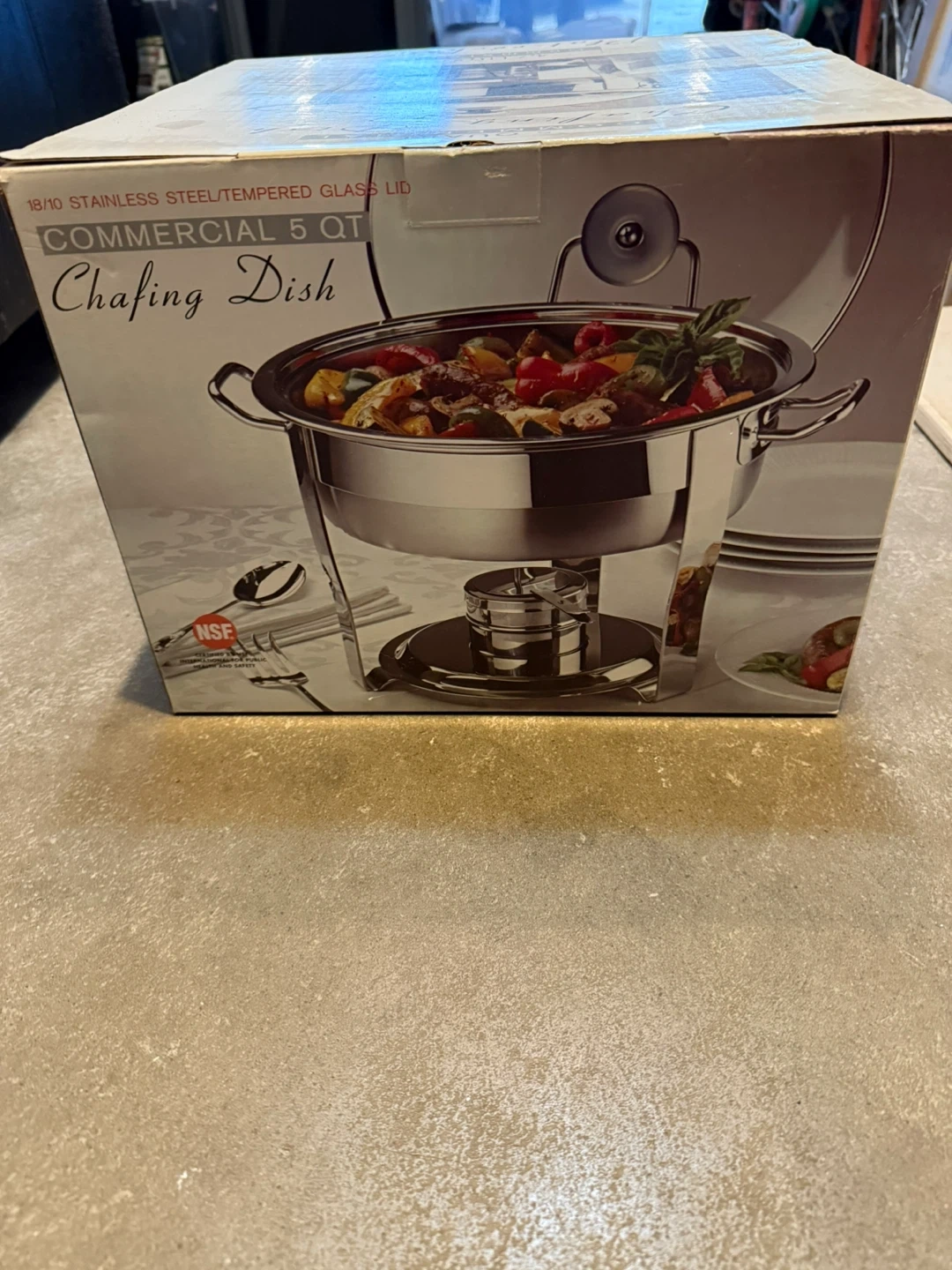 Brand new, never used Commercial 5 QT Chafing Dish still in its original packaging! Features 18/10 stainless steel with a tempered glass lid. Perfect for keeping food warm at parties or gatherings. Box included!