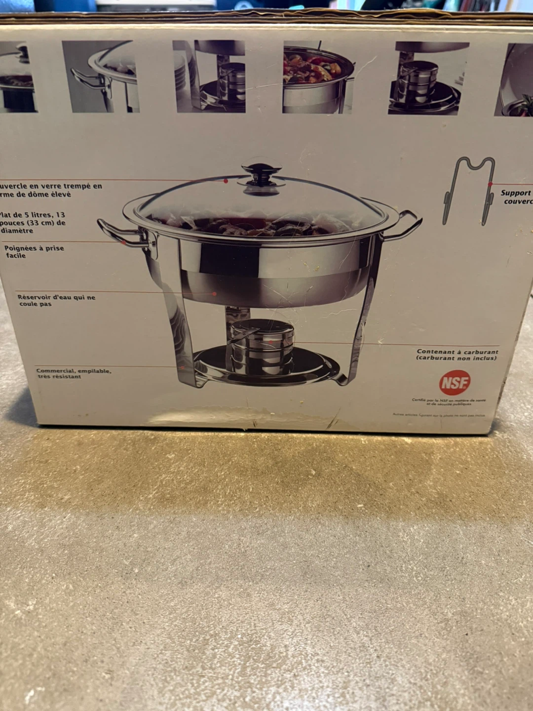 Brand new, never used Commercial 5 QT Chafing Dish still in its original packaging! Features 18/10 stainless steel with a tempered glass lid. Perfect for keeping food warm at parties or gatherings. Box included!