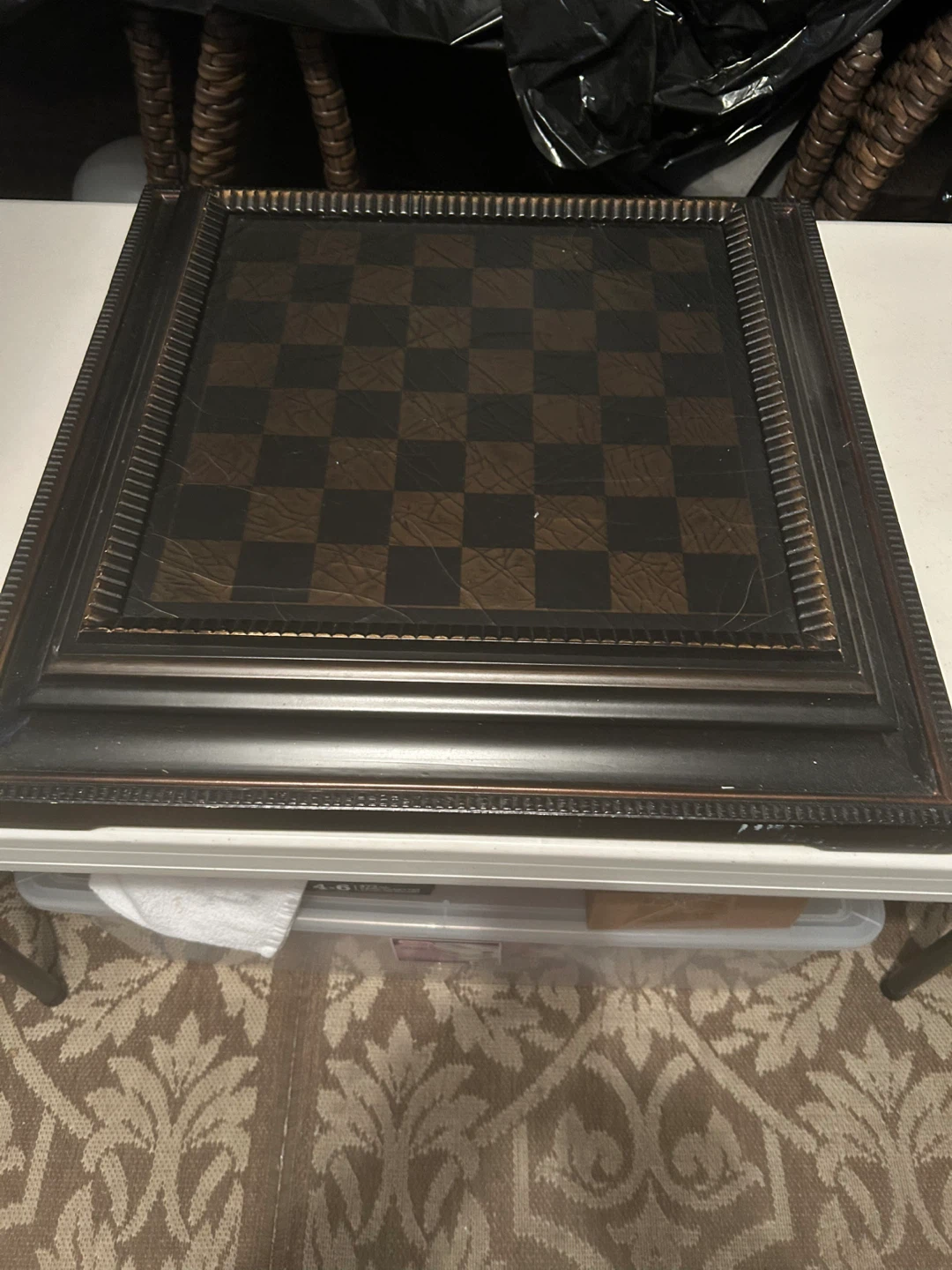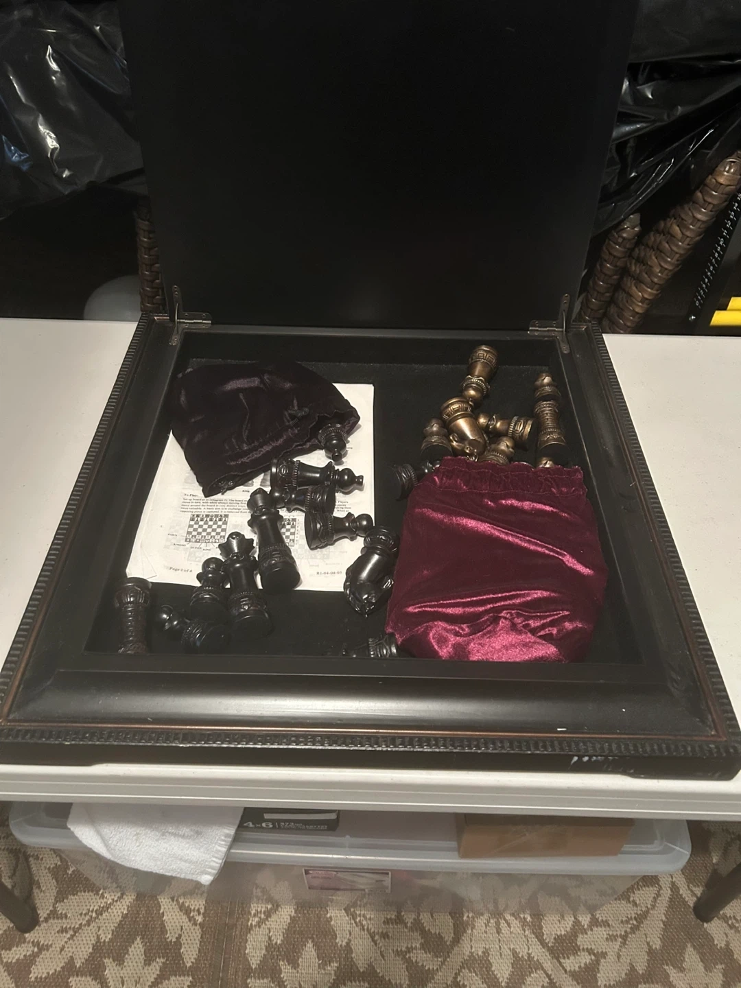 This is a wooden chess/checkers set with a decorative frame and built-in storage. It includes two sets of chess pieces in velvet pouches. Perfect for game nights or as a decorative piece!