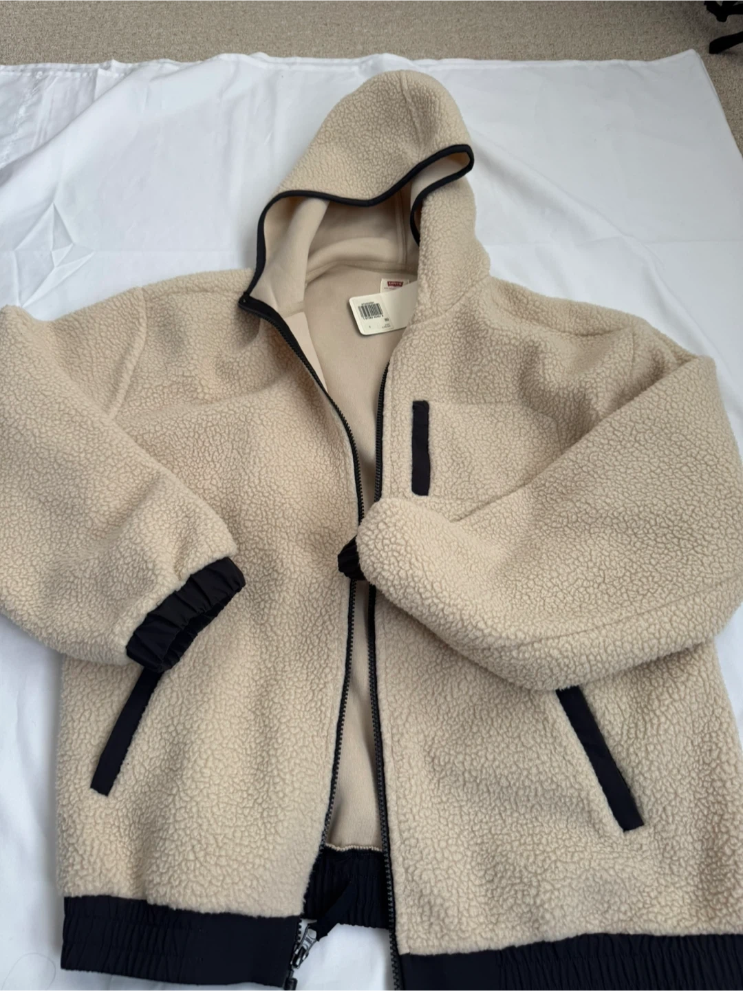 This is a Levi's sherpa fleece hooded jacket. It's beige and features black trim and zippers. Size is small.