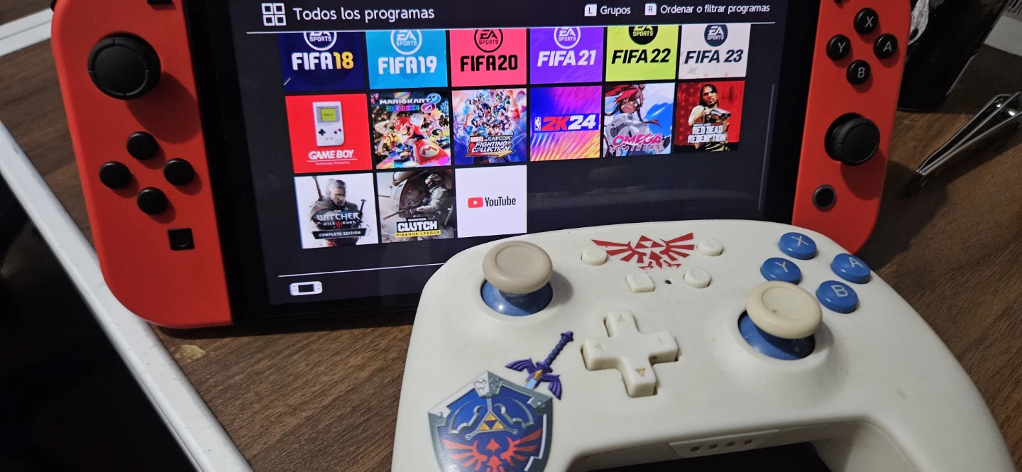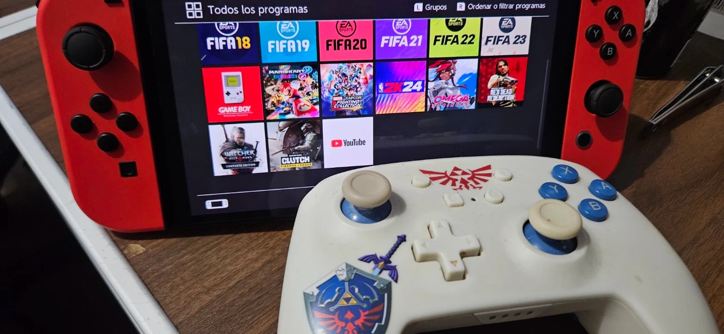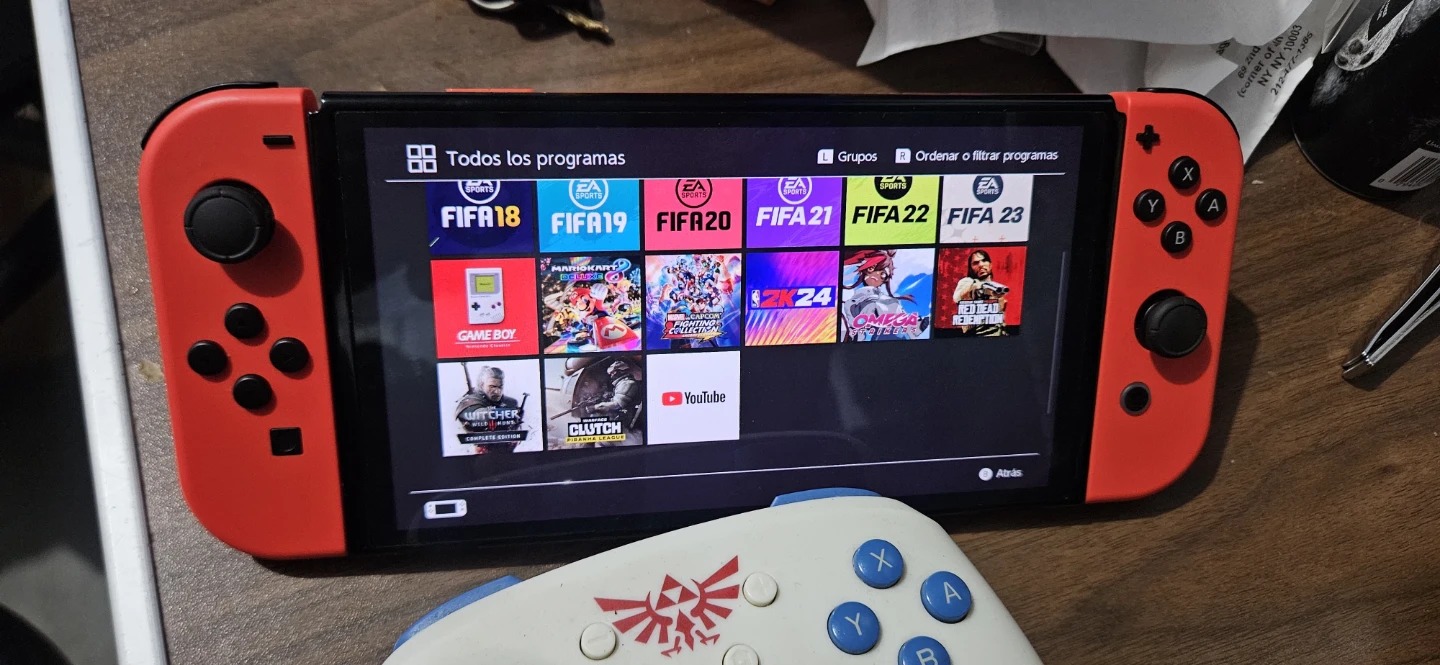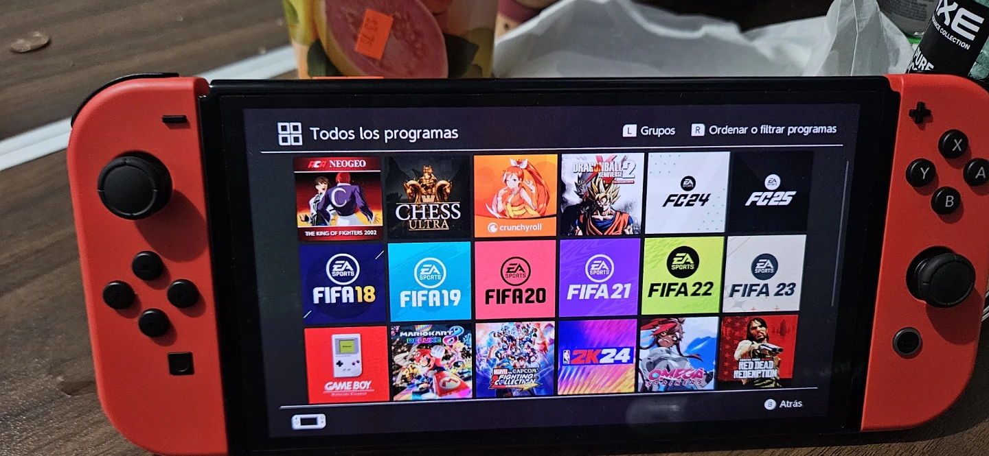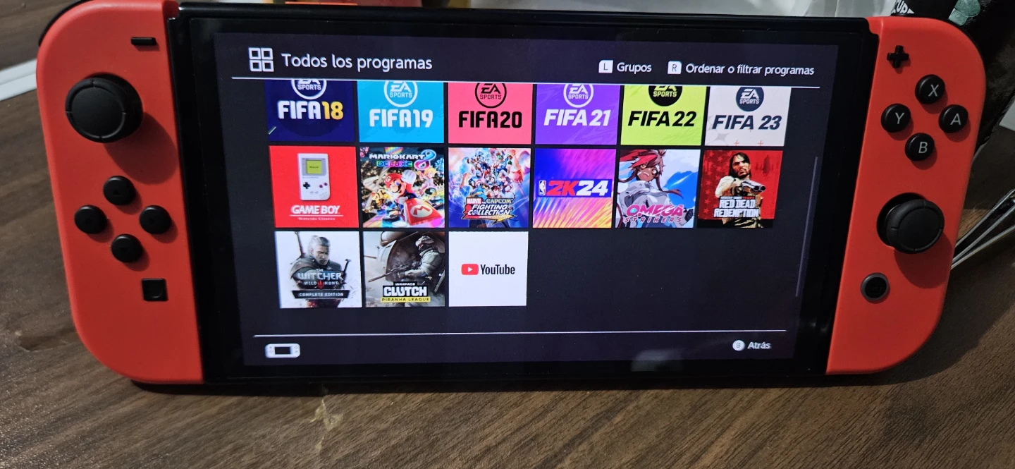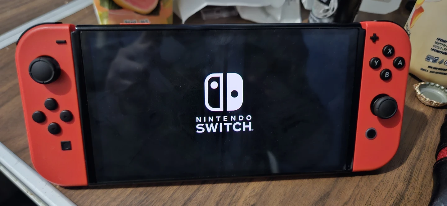 Red Nintendo Switch console. It's a handheld gaming device with a vibrant screen. Includes multiple games like FIFA and Mario Kart.