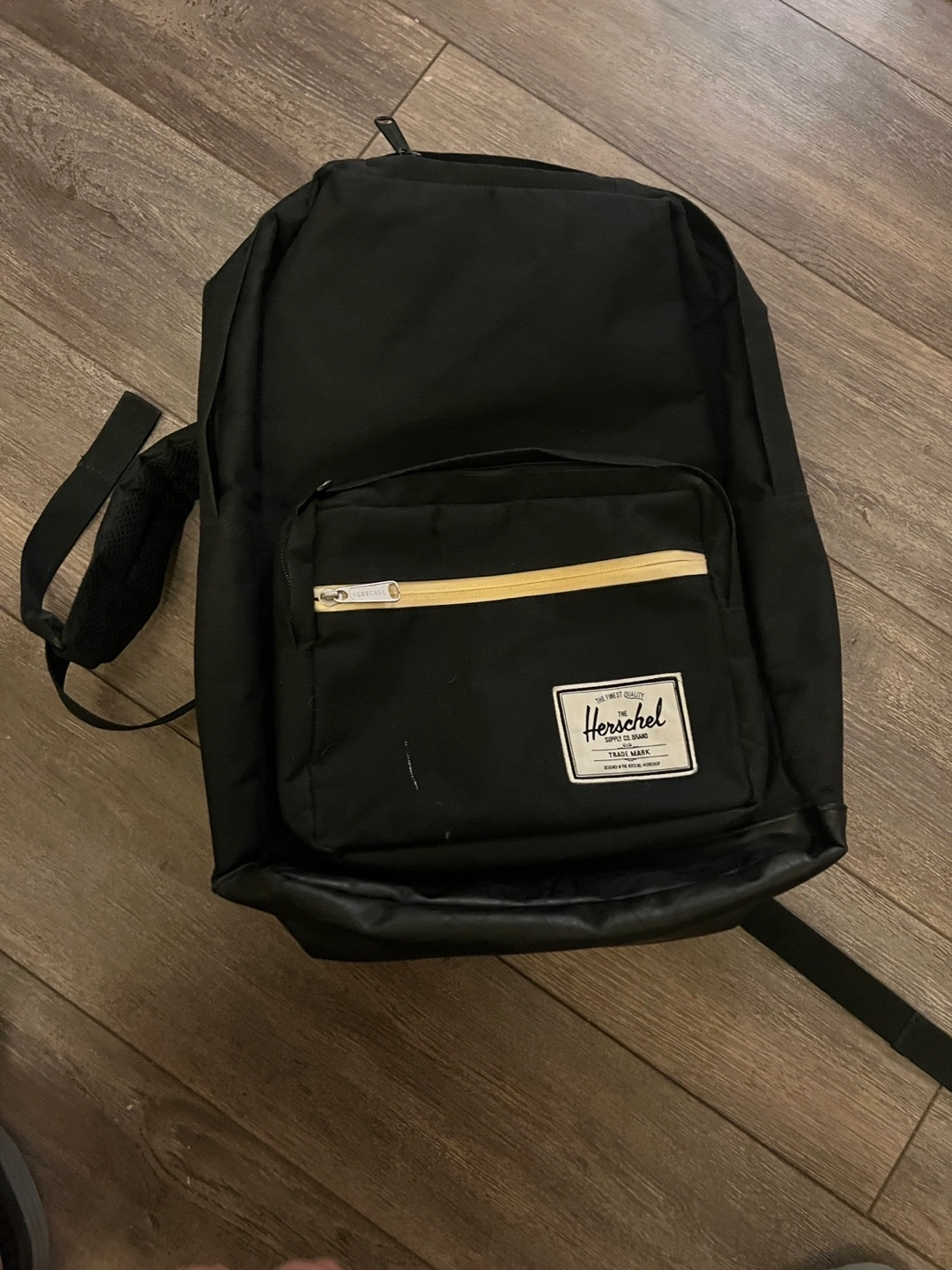 Black backpack, several compartments. Features red and white striped interior lining. Adjustable straps. Good for everyday use.