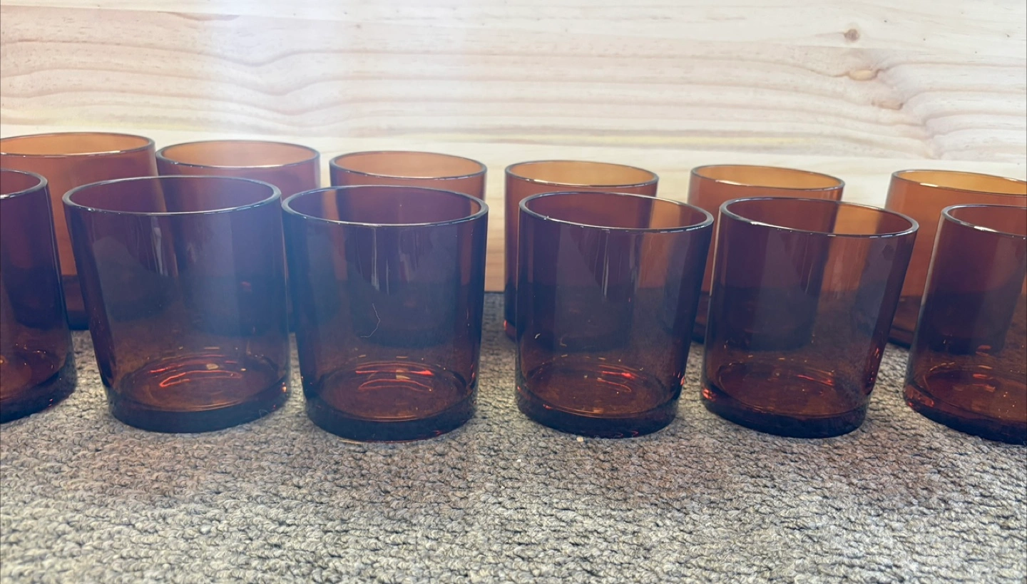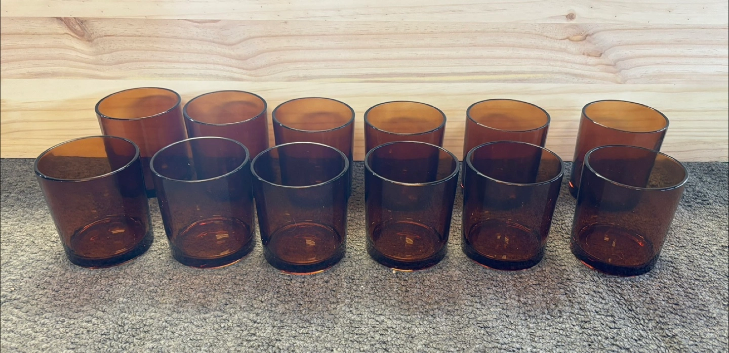 12 pack of amber 12oz candle glasses, use for making your own candles to keep or sell. Recommend hand washing not dishwasher. Glasses do not come with lids.