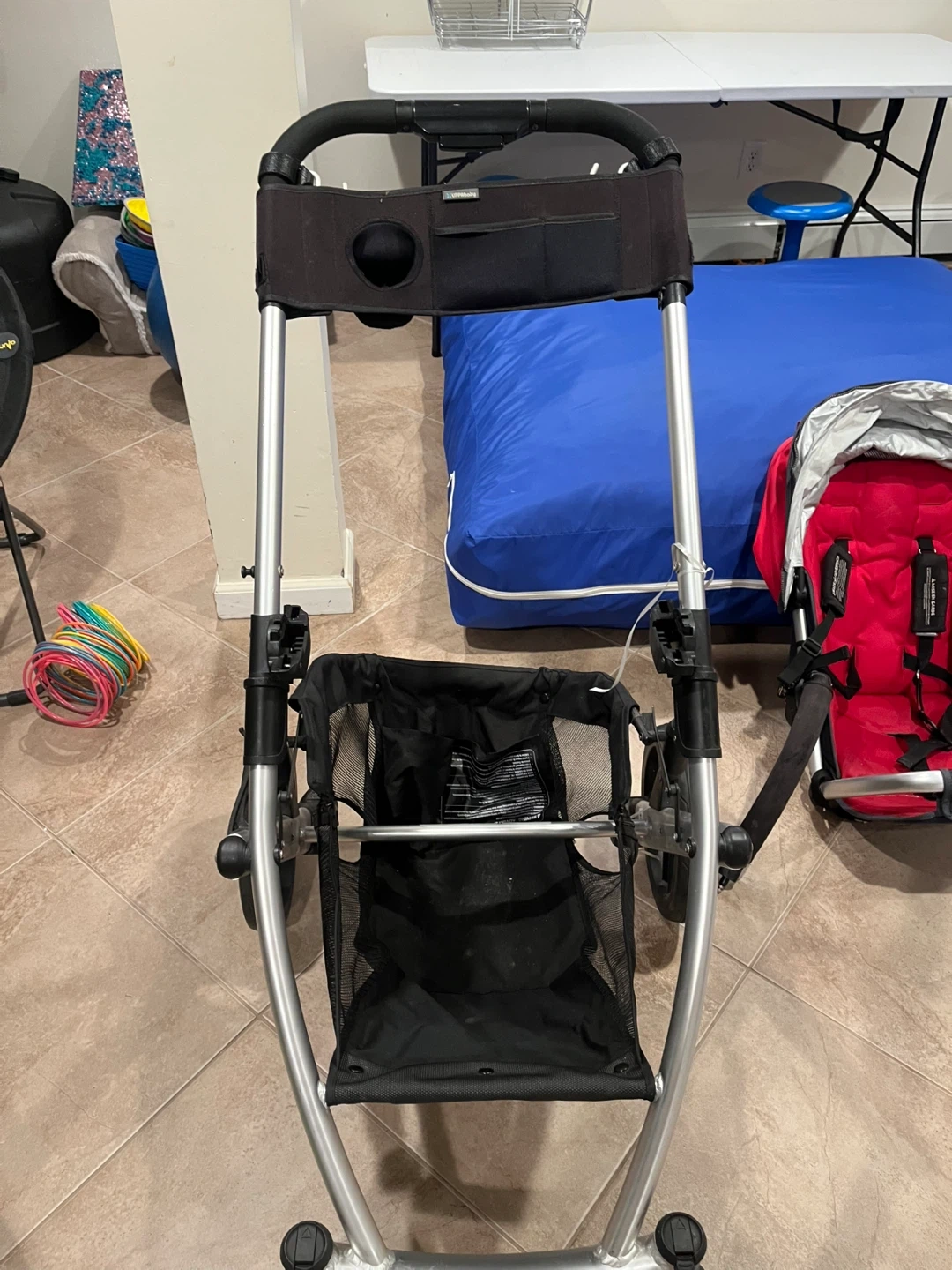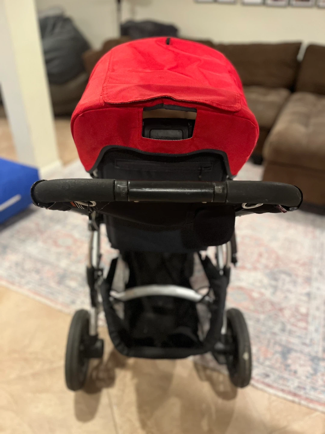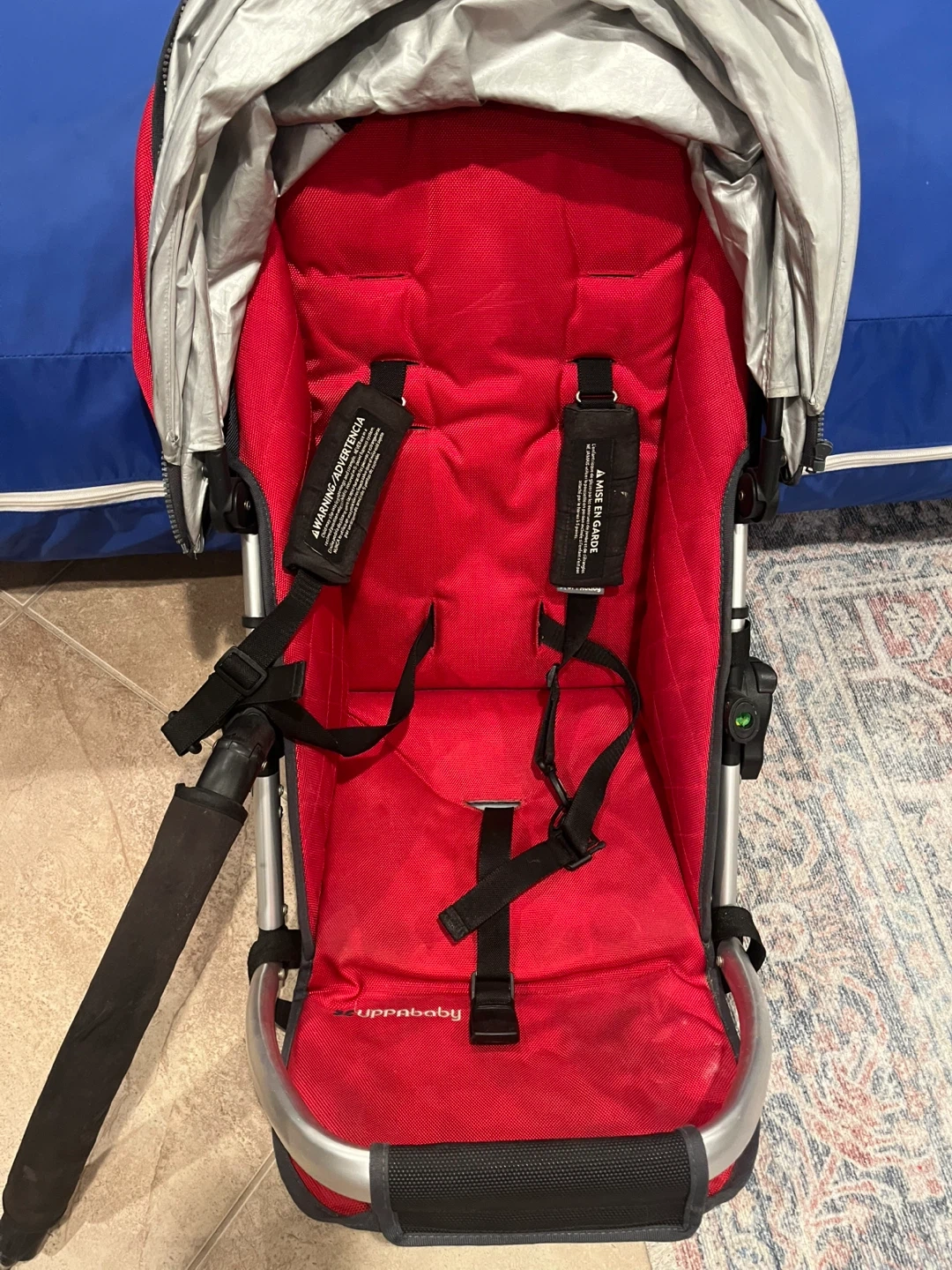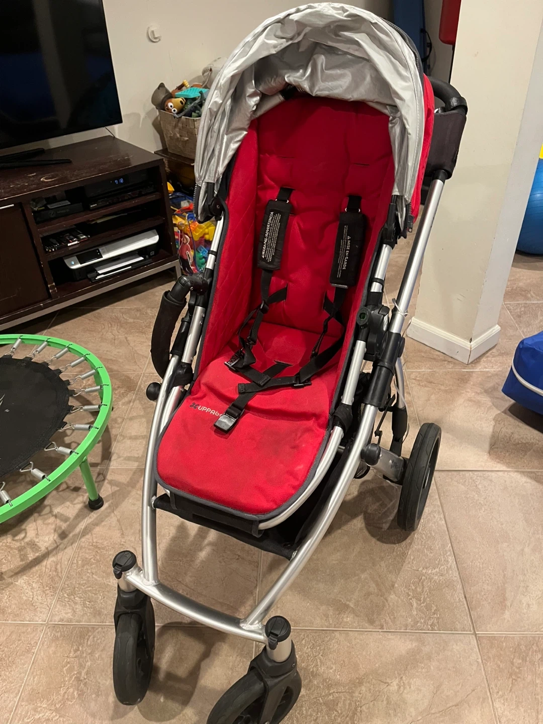 This UPPAbaby Vista stroller comes in red with a silver canopy. It features a 5-point harness for safety. The stroller has a convenient storage basket underneath. This stroller is like new, has good mobility and includes all parts.
