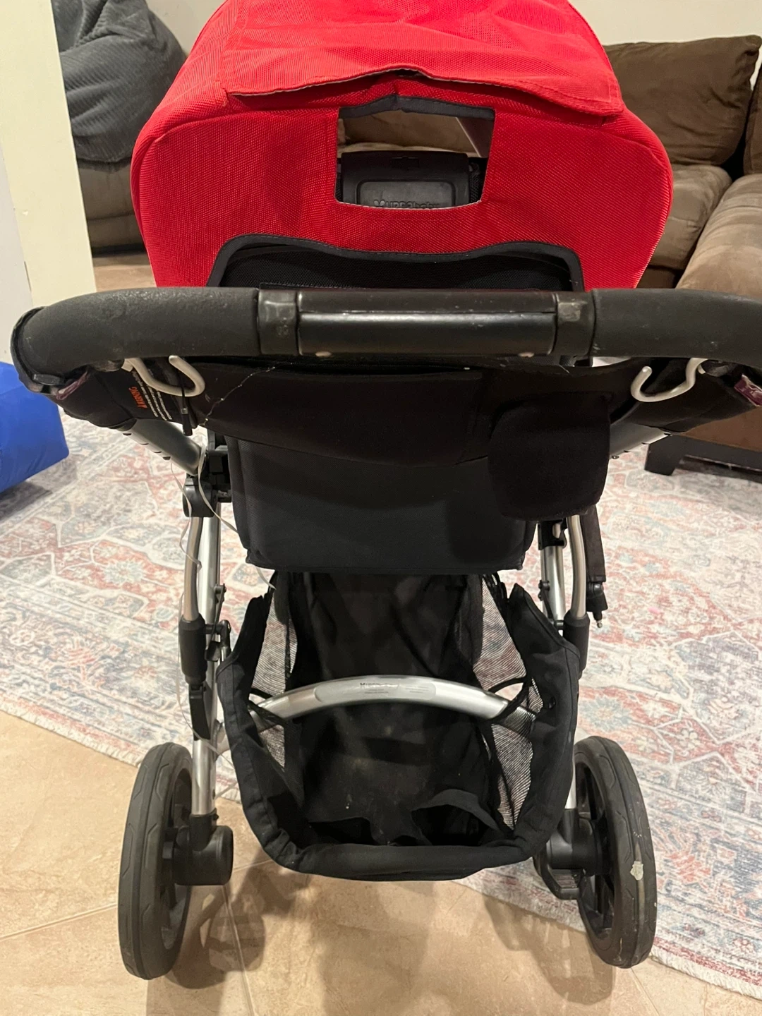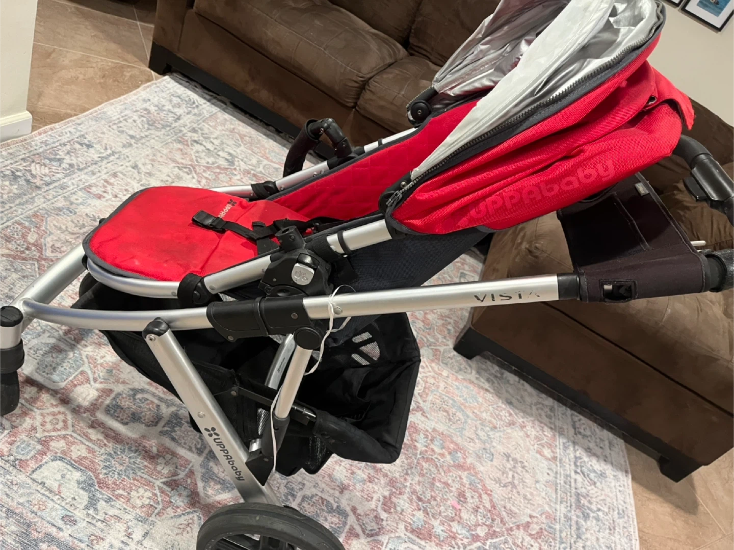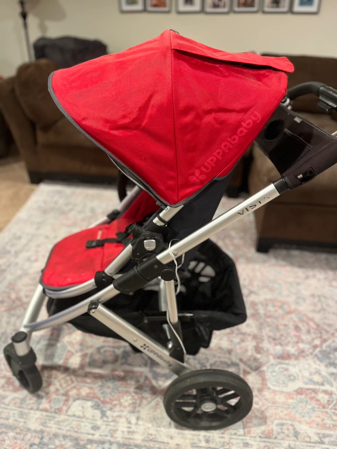 This UPPAbaby Vista stroller comes in red with a silver canopy. It features a 5-point harness for safety. The stroller has a convenient storage basket underneath. This stroller is like new, has good mobility and includes all parts.