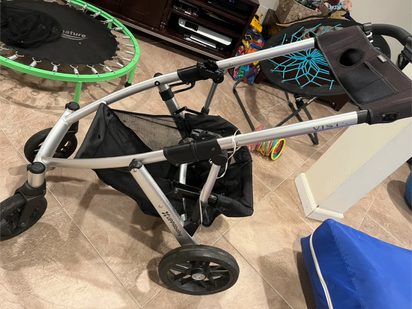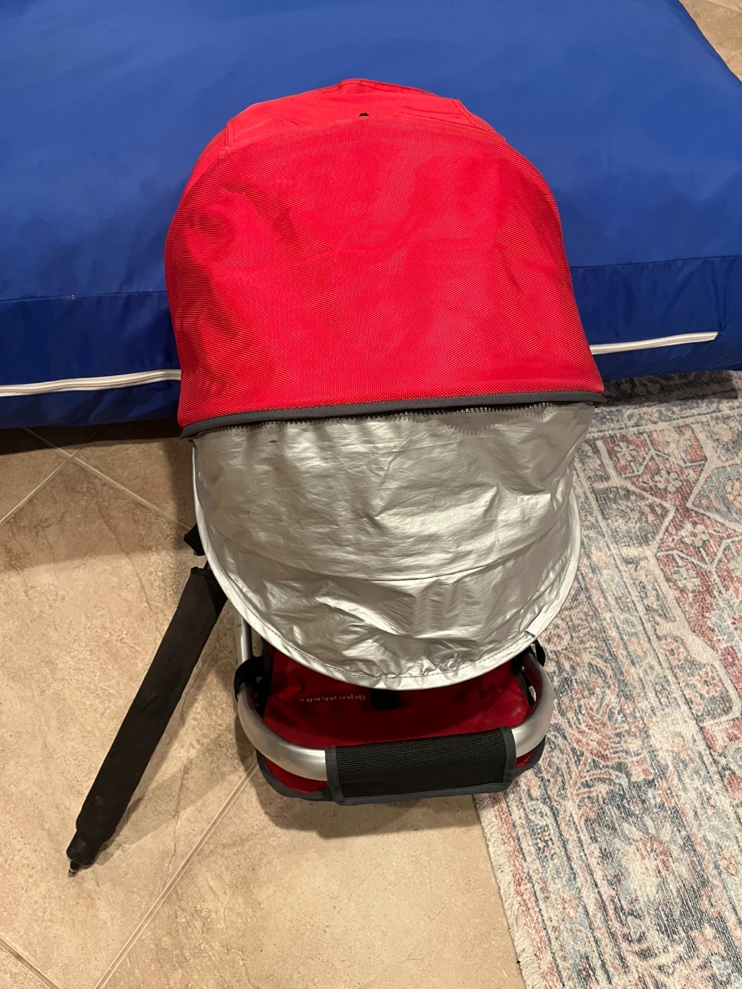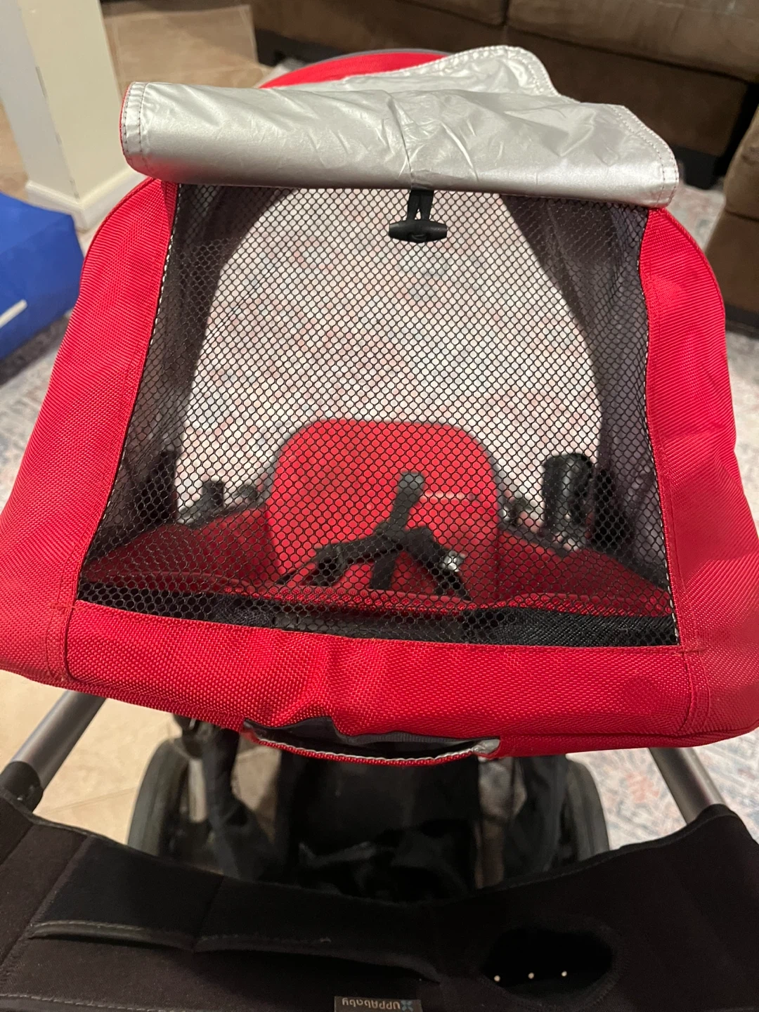 This UPPAbaby Vista stroller comes in red with a silver canopy. It features a 5-point harness for safety. The stroller has a convenient storage basket underneath. This stroller is like new, has good mobility and includes all parts.