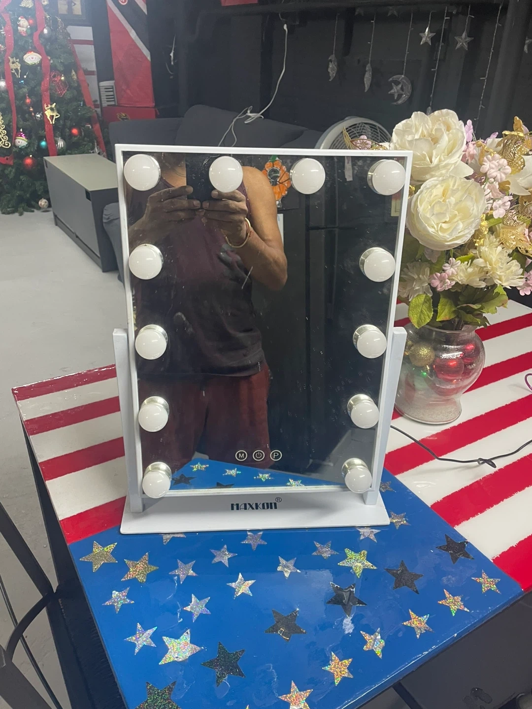This is a MAXKON vanity mirror with 10 LED bulbs for bright illumination. It's a white, tabletop mirror perfect for makeup application. The mirror has touch controls and can be adjusted.