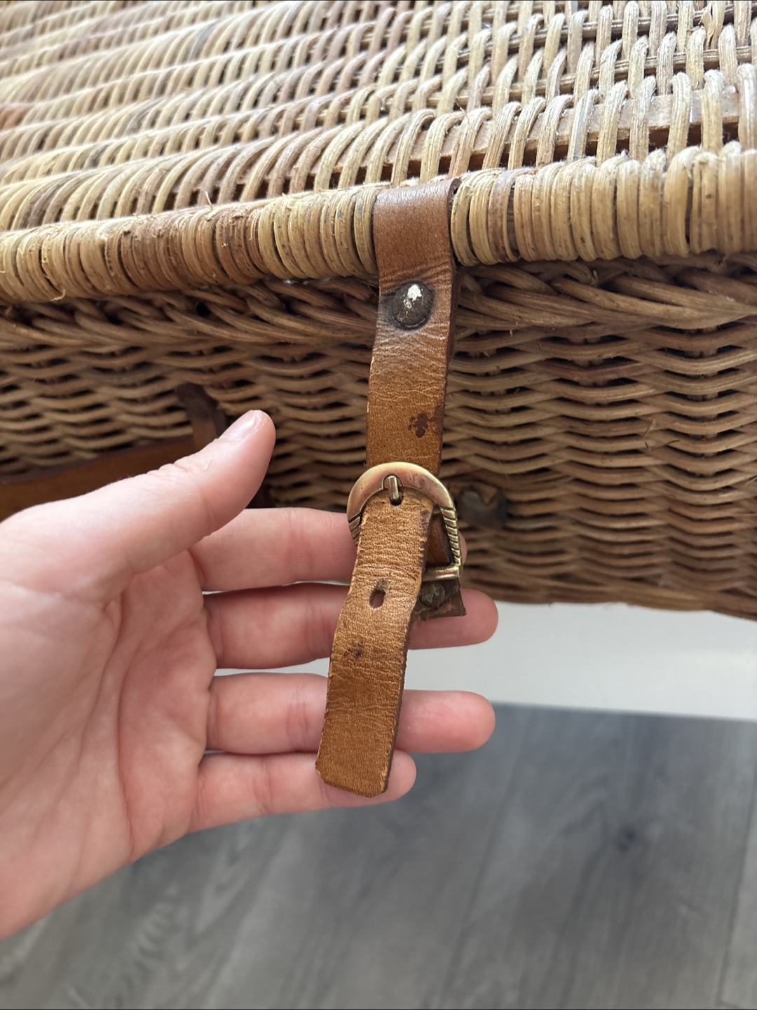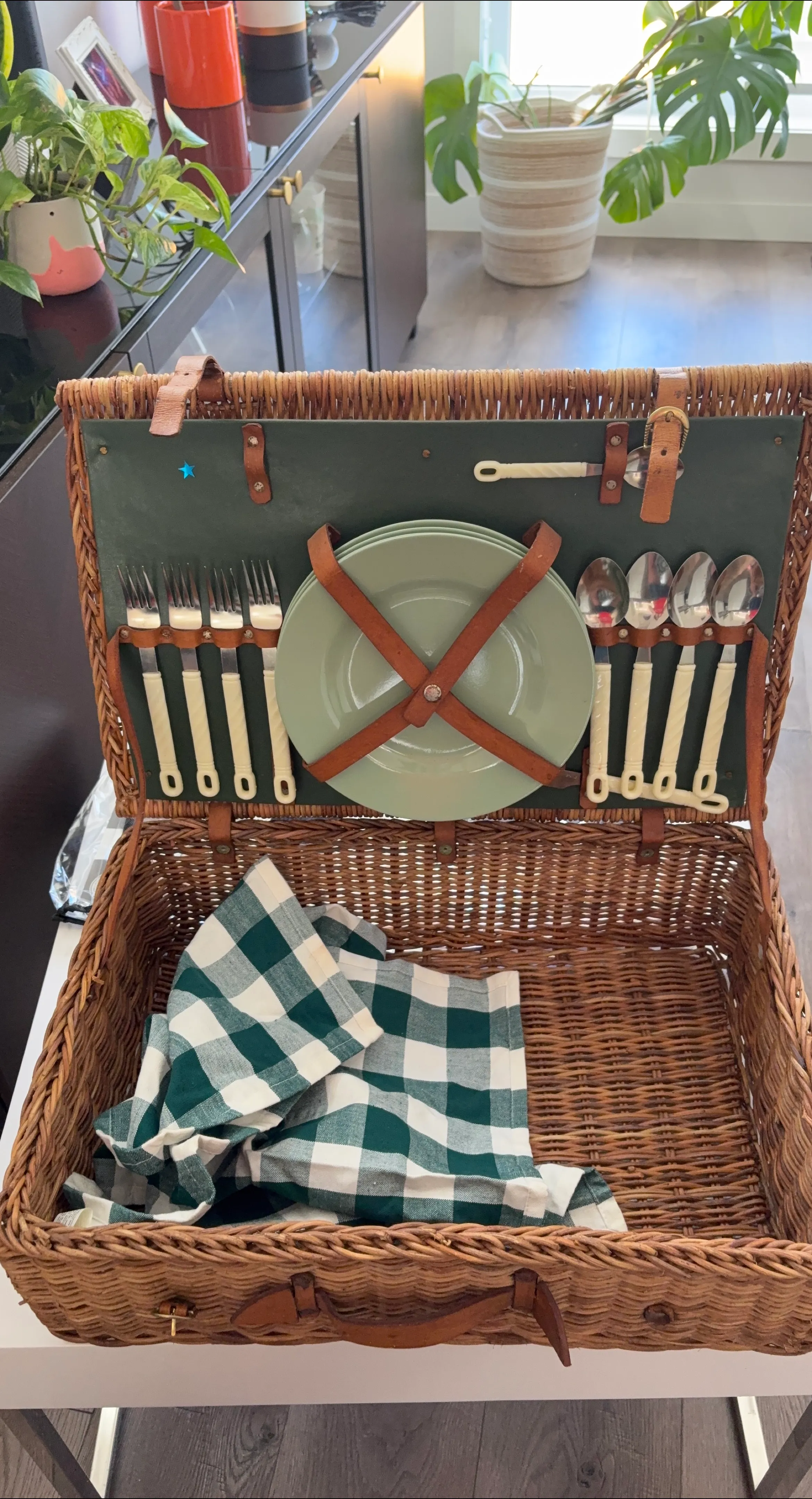 Selling a charming wicker picnic basket set! It comes with plates, cutlery, and a checkered blanket. Perfect for a lovely day out in the park or by the lake!