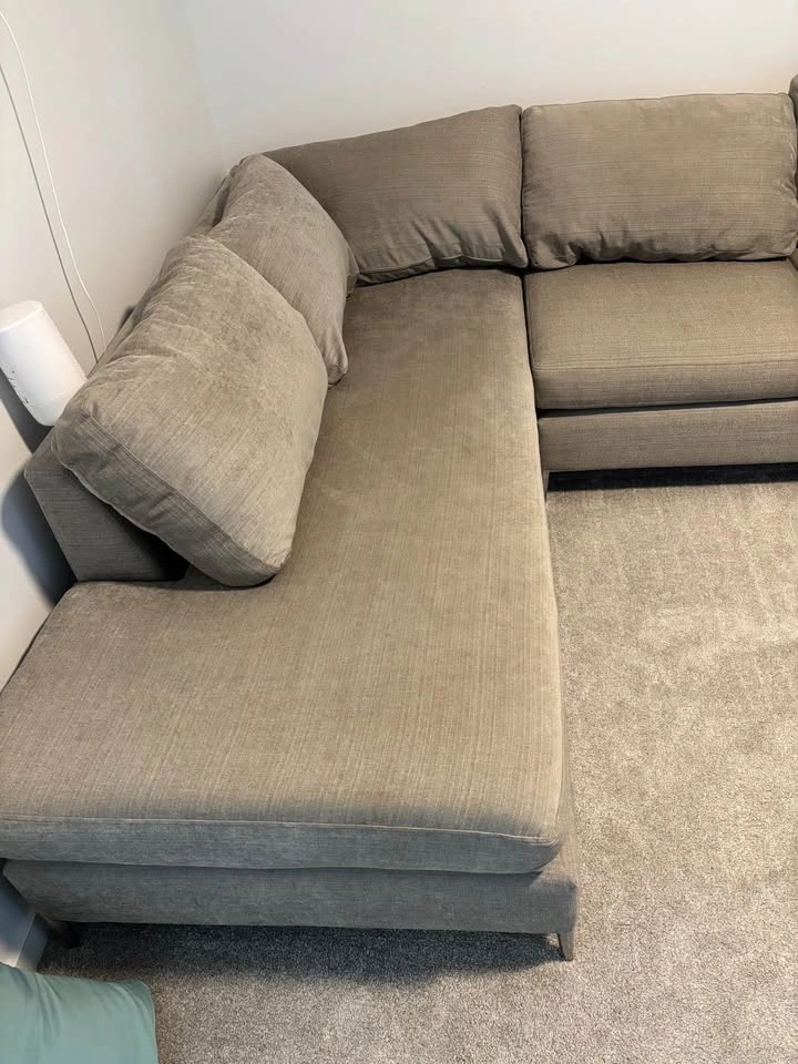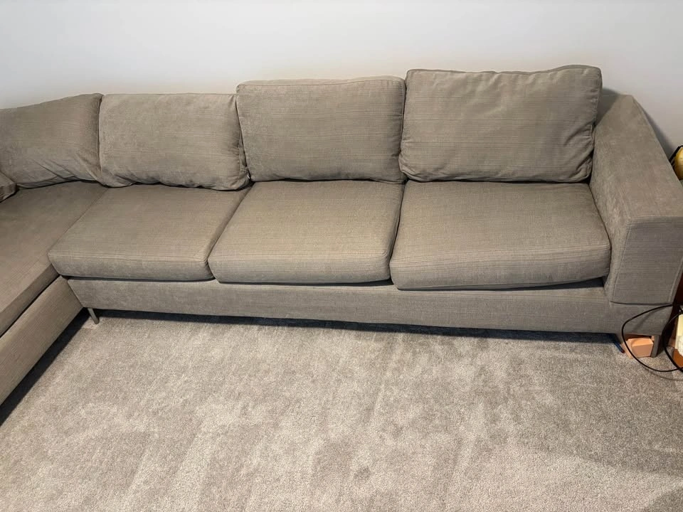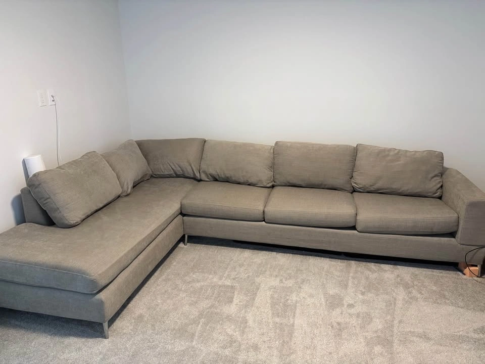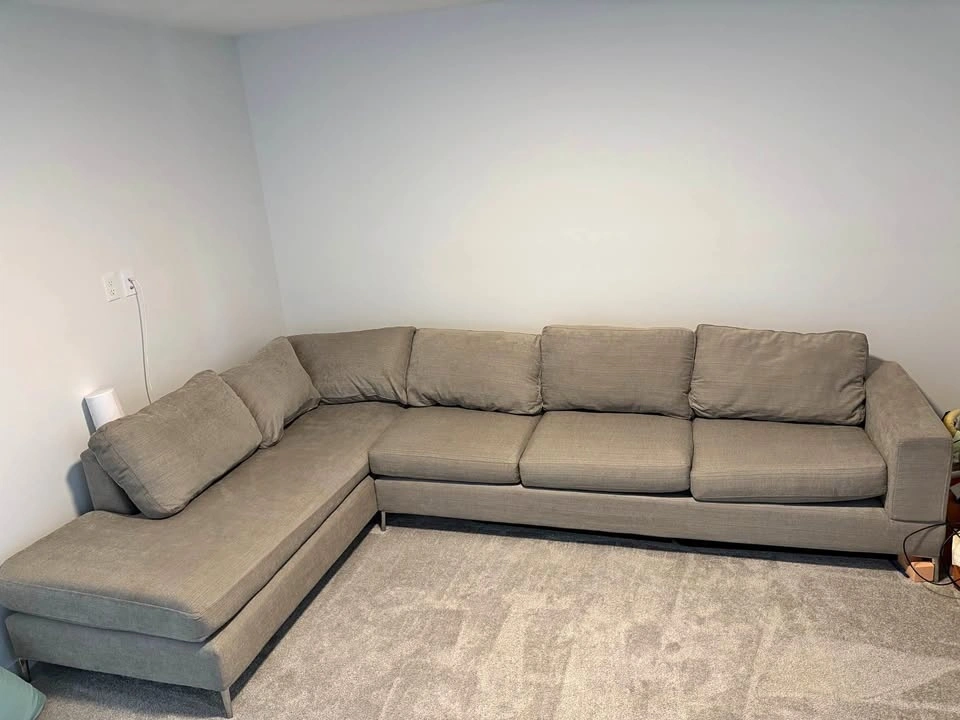 Great condition gray L-shaped sectional couch. 11 ft long side, 7 ft short side, 3 ft deep. Comfortable and clean, with plump cushions. $400 obo