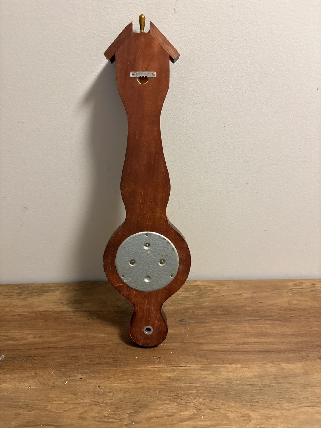This is a wooden barometer and thermometer. It has a classic design with a brass dial. The thermometer displays Fahrenheit temperatures.