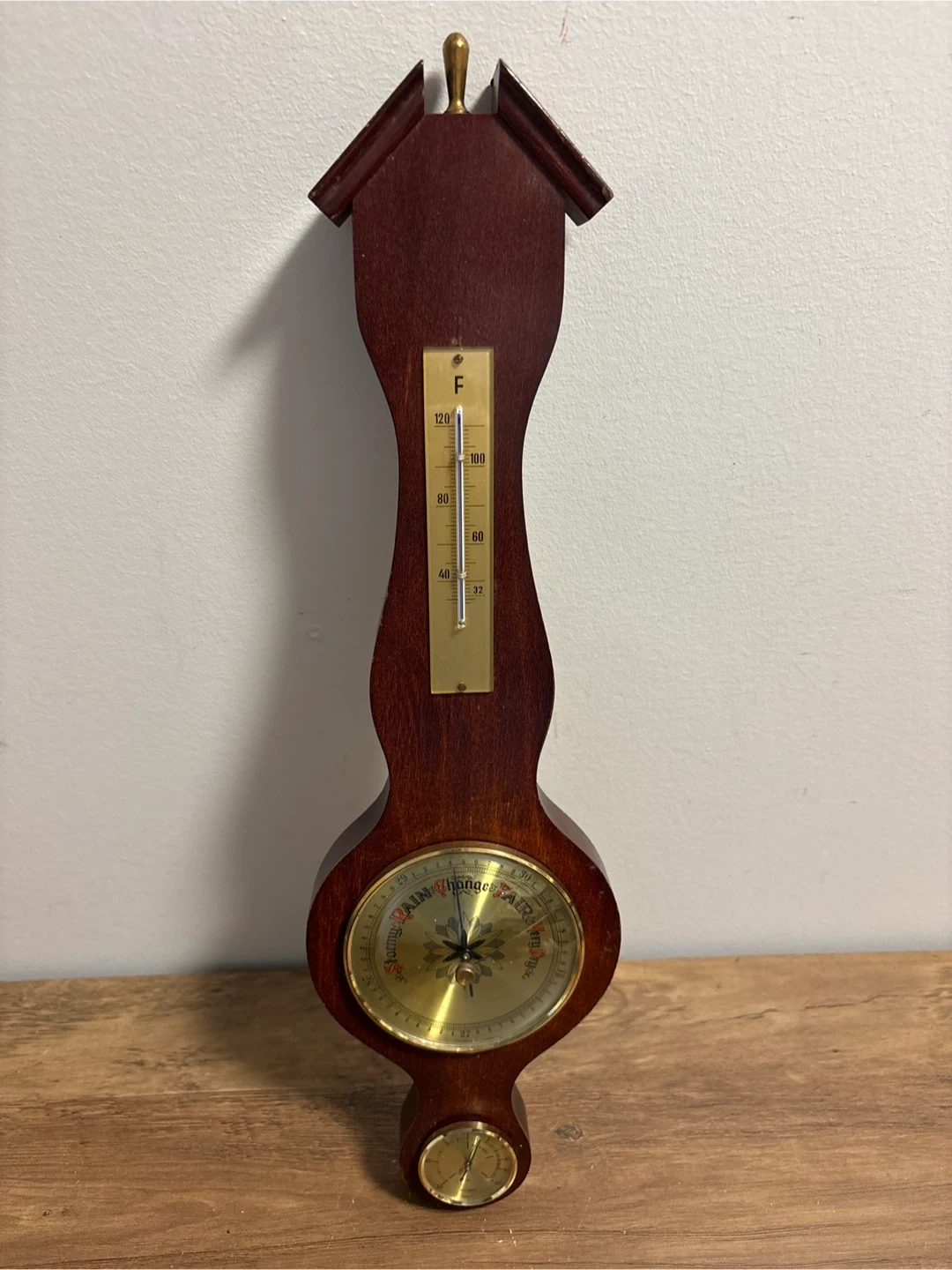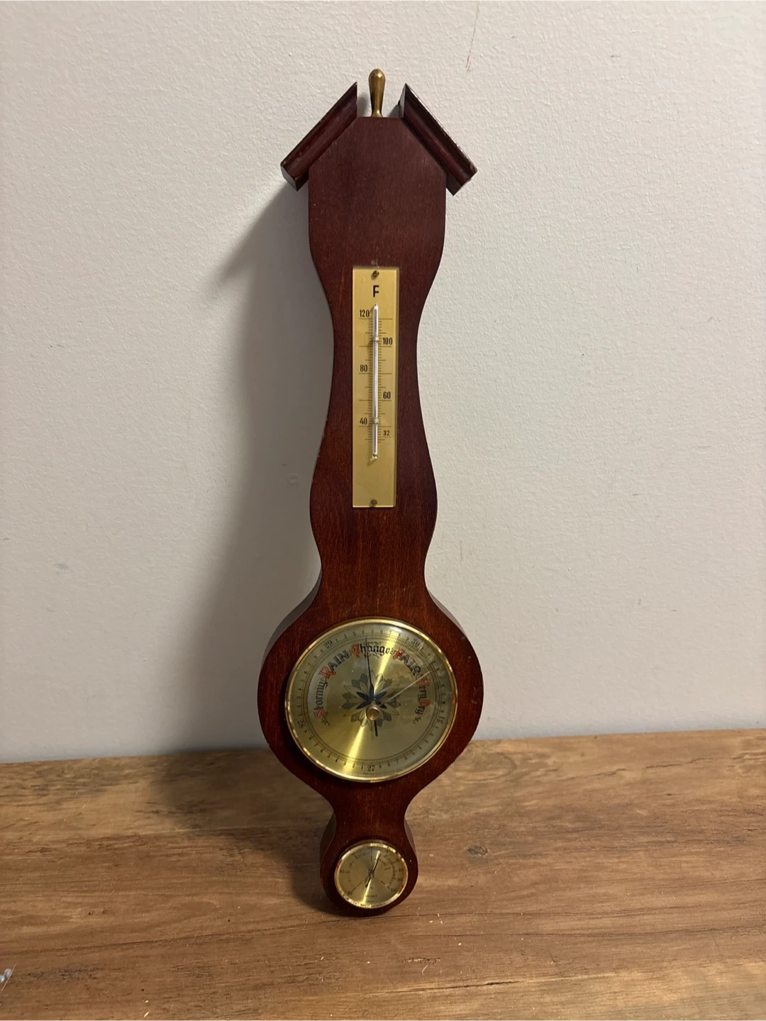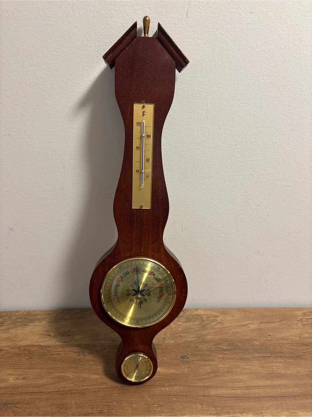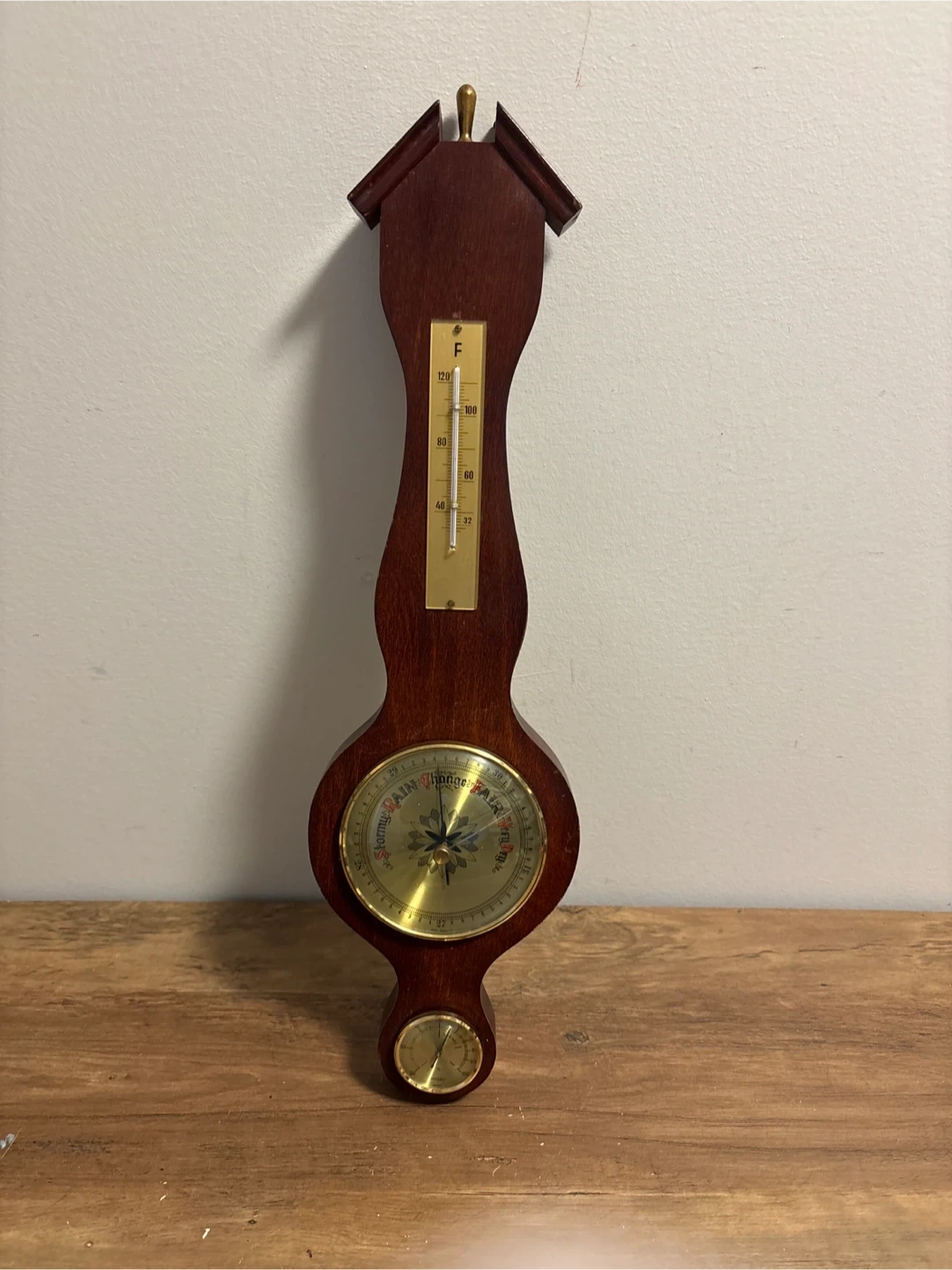 This is a wooden barometer and thermometer. It has a classic design with a brass dial. The thermometer displays Fahrenheit temperatures.