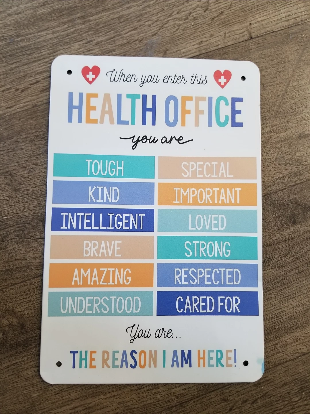 This sign reads 'When you enter this HEALTH OFFICE you are tough, kind, intelligent, brave, amazing, understood, special, important, loved, strong, respected, and cared for.' It also states 'You are... the reason I am here!'. Brand new Metal Sign 8x12