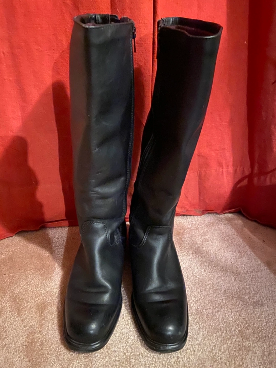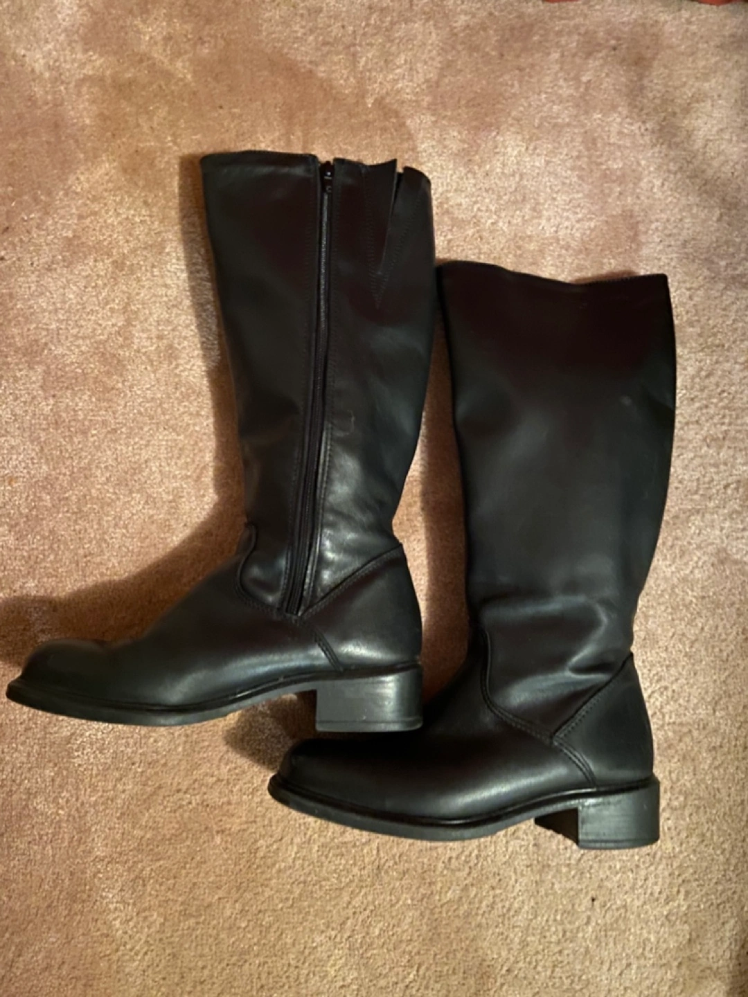 Pair of black leather riding boots. Side zipper closure. Low block heel. Good for everyday wear. Made in Canada π