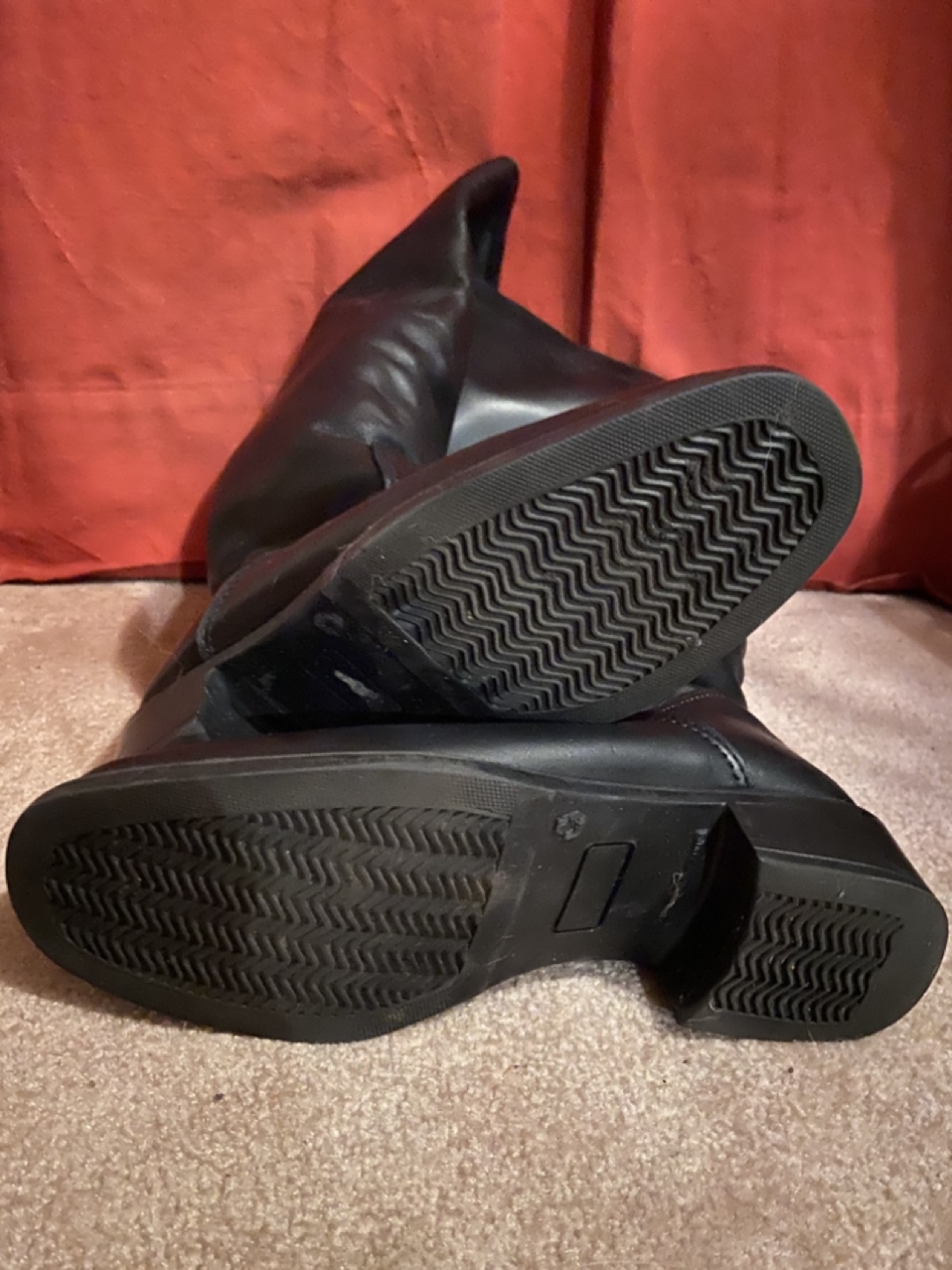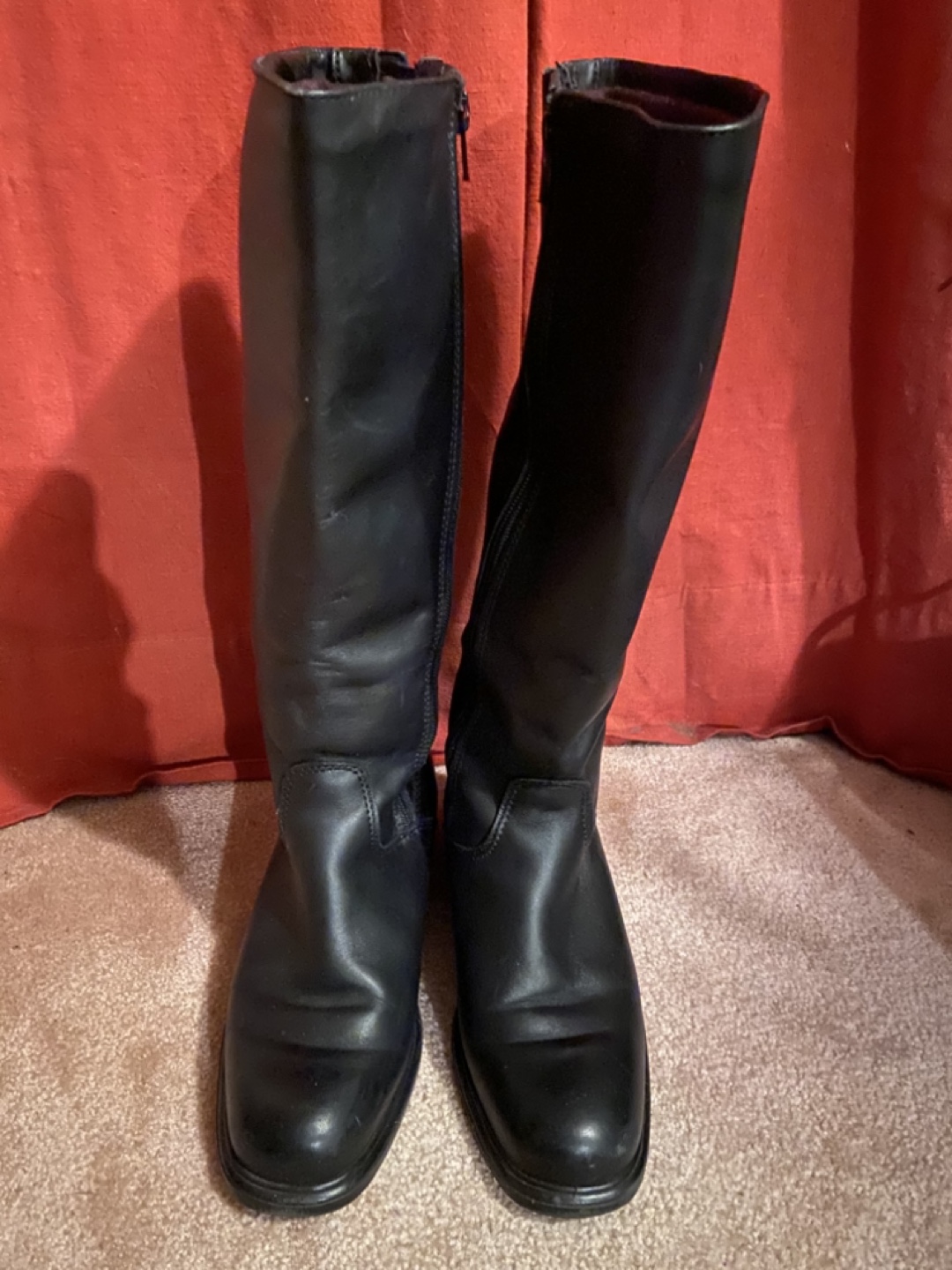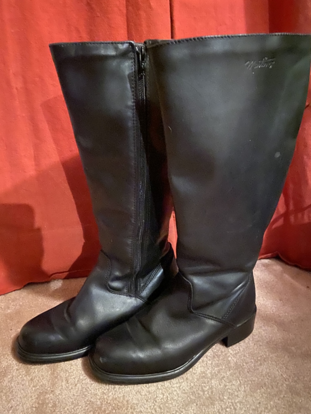 Pair of black leather riding boots. Side zipper closure. Low block heel. Good for everyday wear. Made in Canada π