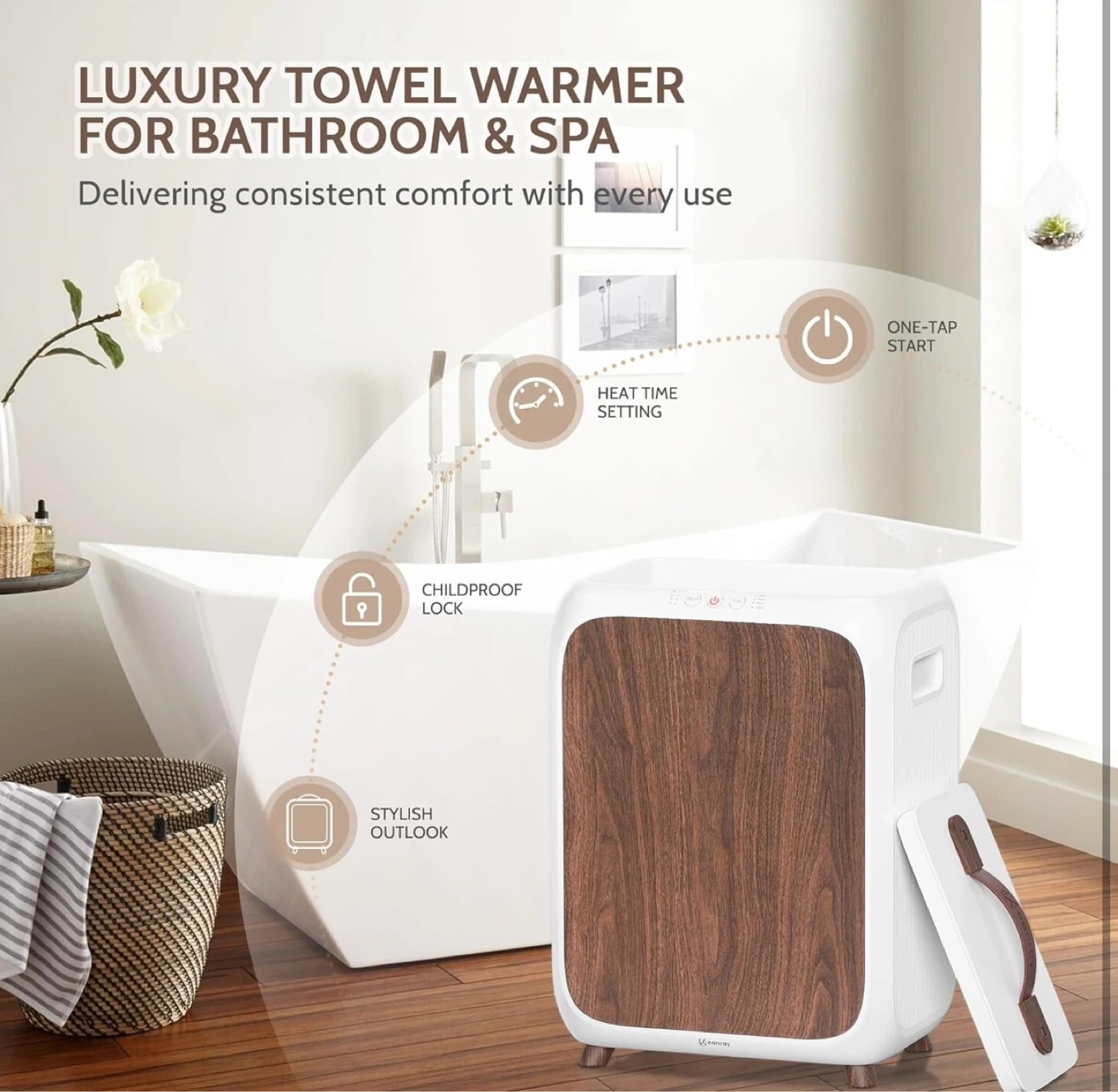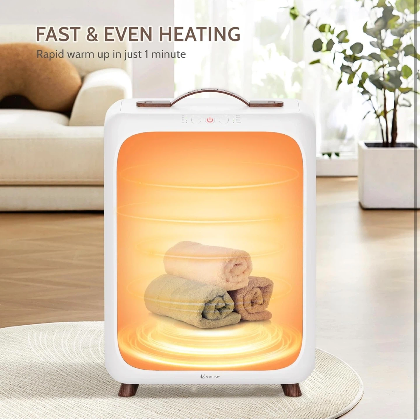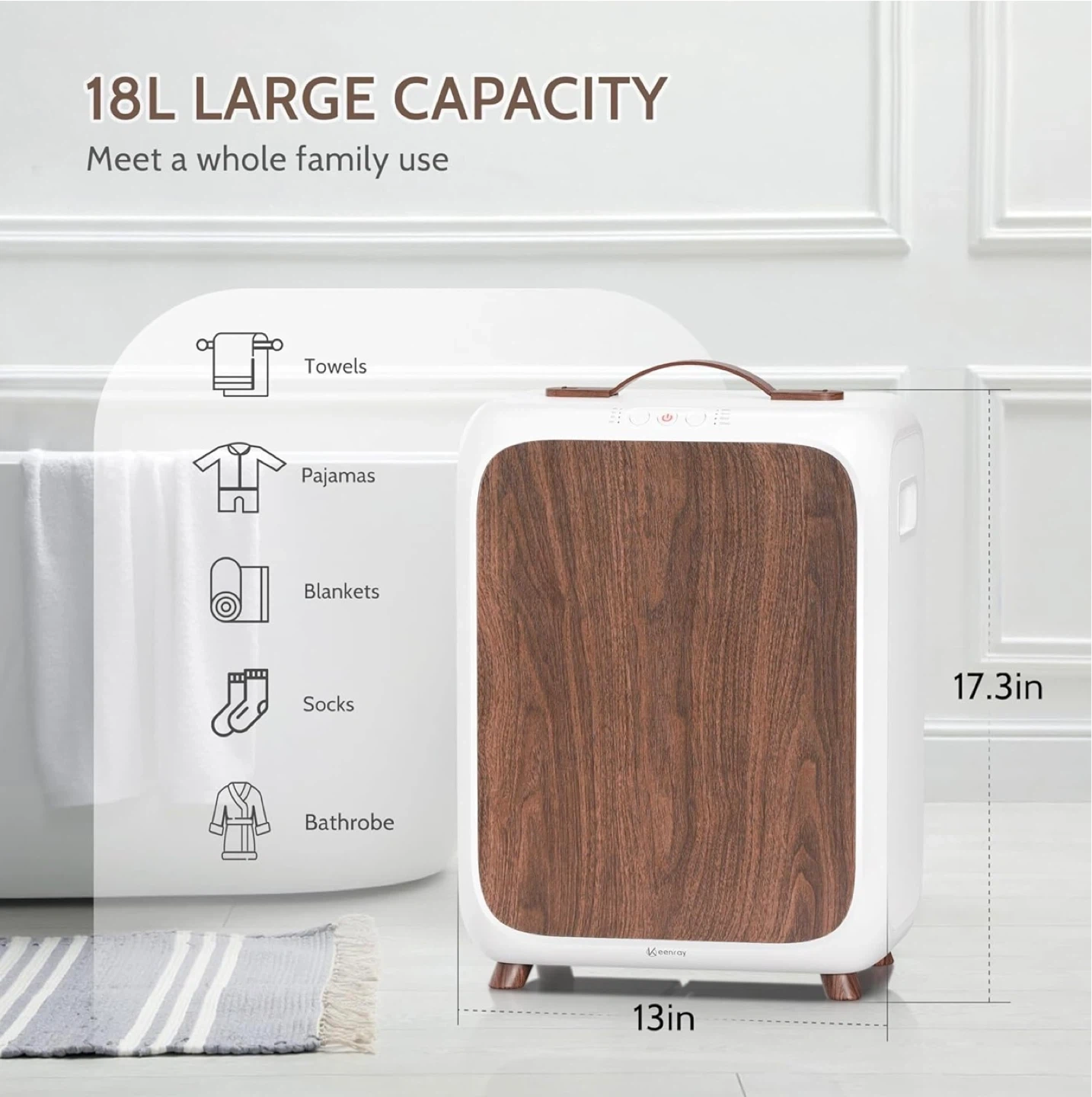 S This Keenray towel warmer has an 18L capacity, perfect for whole family use. It features a one-tap start, heat time setting, and a childproof lock. The unit's dimensions are 13 inches wide by 17.3 inches tall, with a stylish wood-grain outlook.