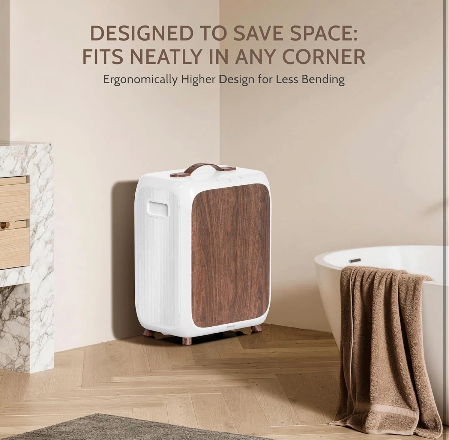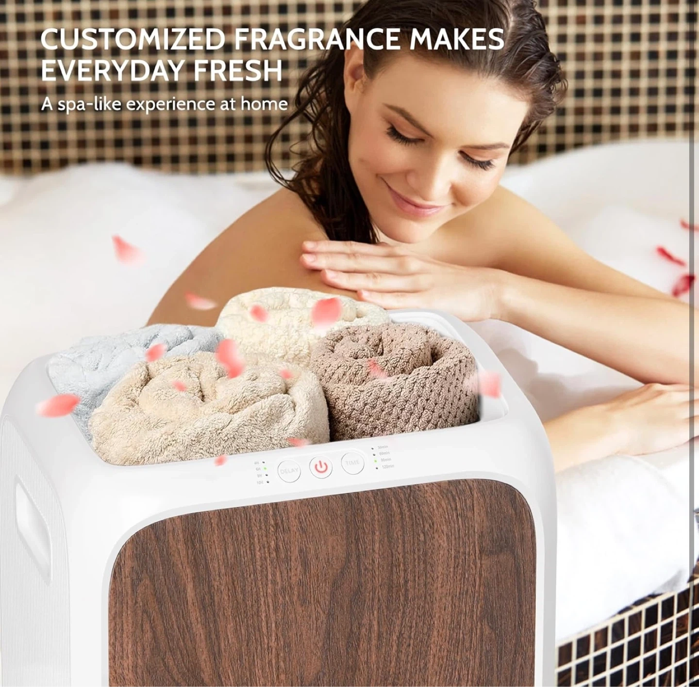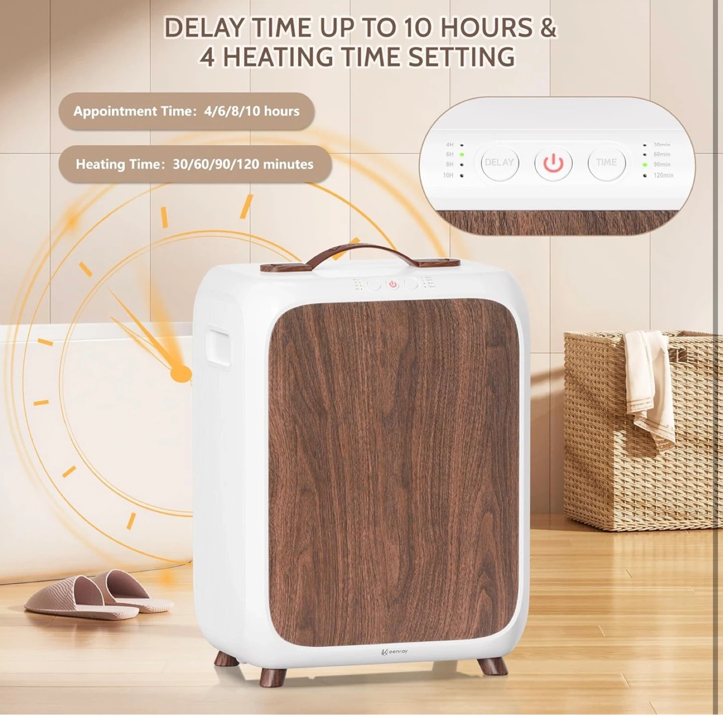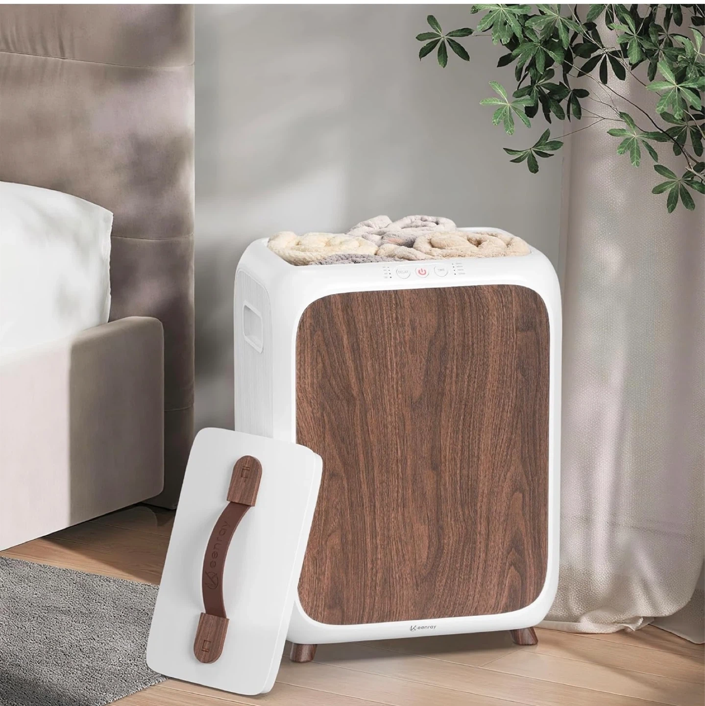 S This Keenray towel warmer has an 18L capacity, perfect for whole family use. It features a one-tap start, heat time setting, and a childproof lock. The unit's dimensions are 13 inches wide by 17.3 inches tall, with a stylish wood-grain outlook.