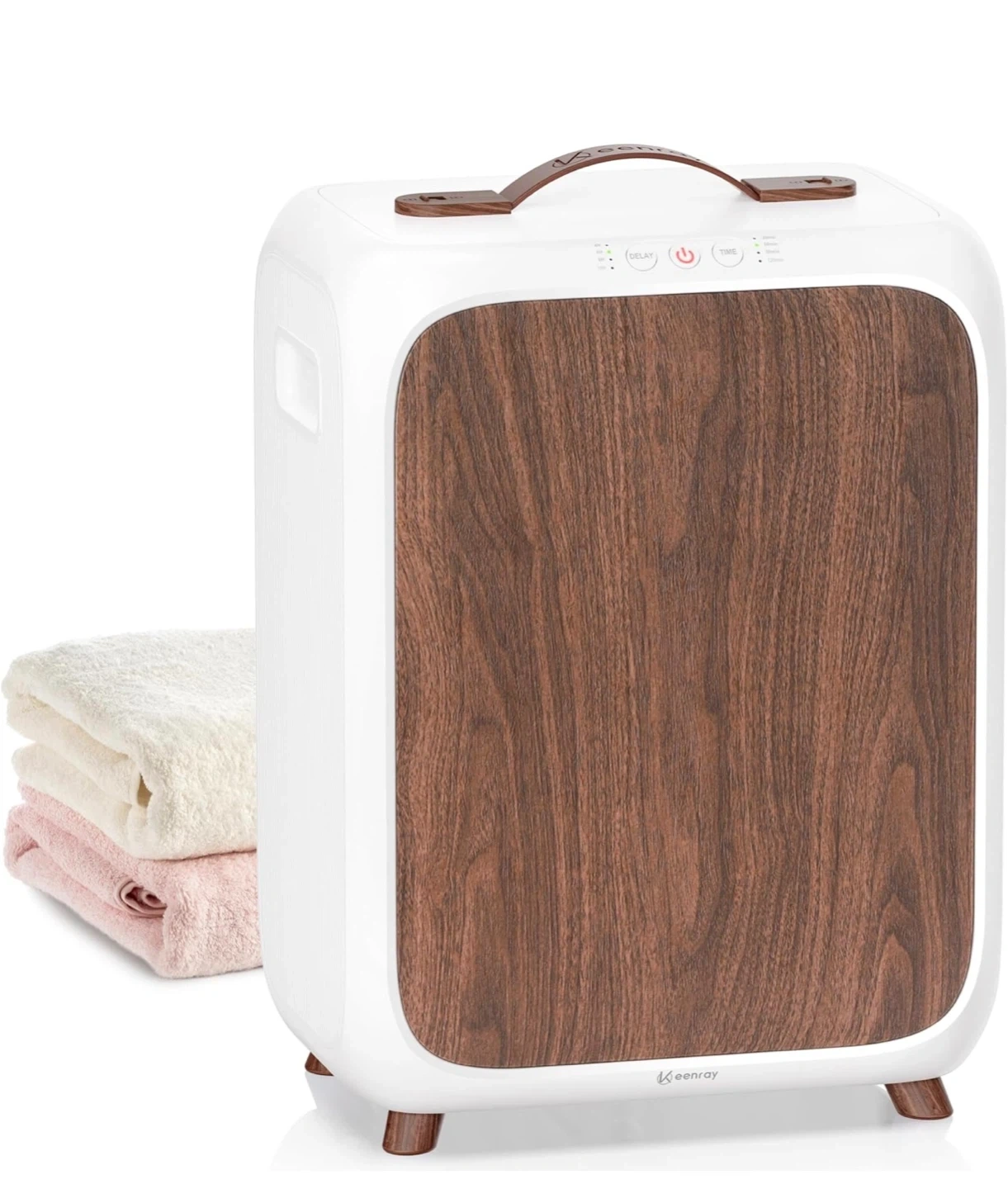 S This Keenray towel warmer has an 18L capacity, perfect for whole family use. It features a one-tap start, heat time setting, and a childproof lock. The unit's dimensions are 13 inches wide by 17.3 inches tall, with a stylish wood-grain outlook.