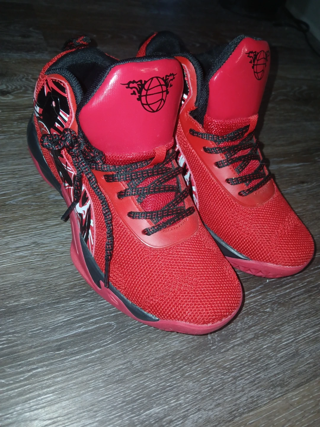 These are red mid-top basketball shoes with black accents. They have a mesh toe box and a grippy rubber sole for traction. Laces are black. A basketball graphic with flames is on the side.