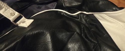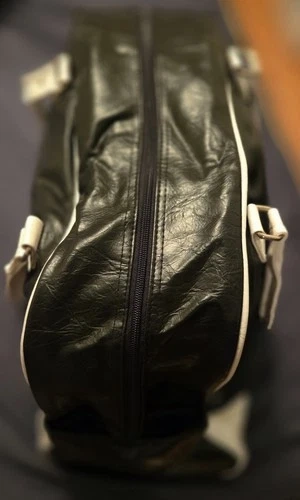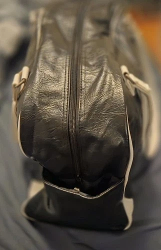 Crafted from premium faux leather, this duffle bag boasts a sleek black and white color scheme. Featuring multiple compartments to keep personal items neatly arranged. Used once, small signs of age on handles, but looks excellent. Vintage purchase around 2005.