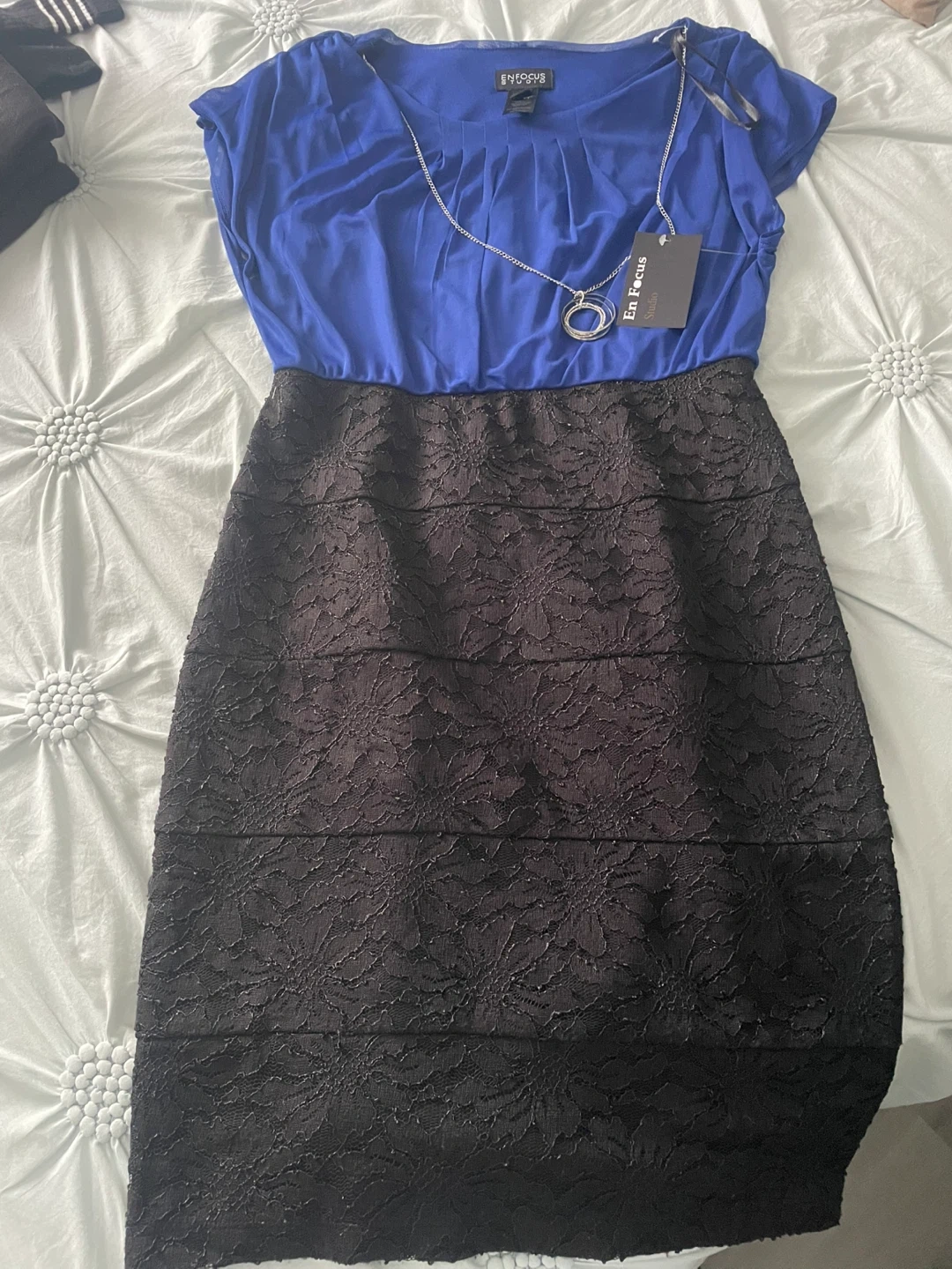 This En Focus Studio dress features a vibrant blue bodice and a black lace skirt with tiered detailing. It comes with a silver-tone pendant necklace. It's great for a night out or special occasion!