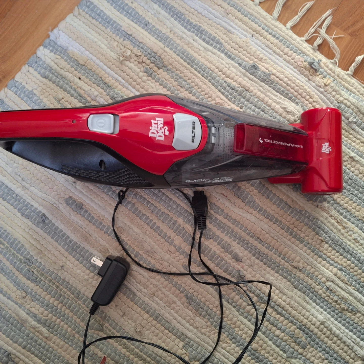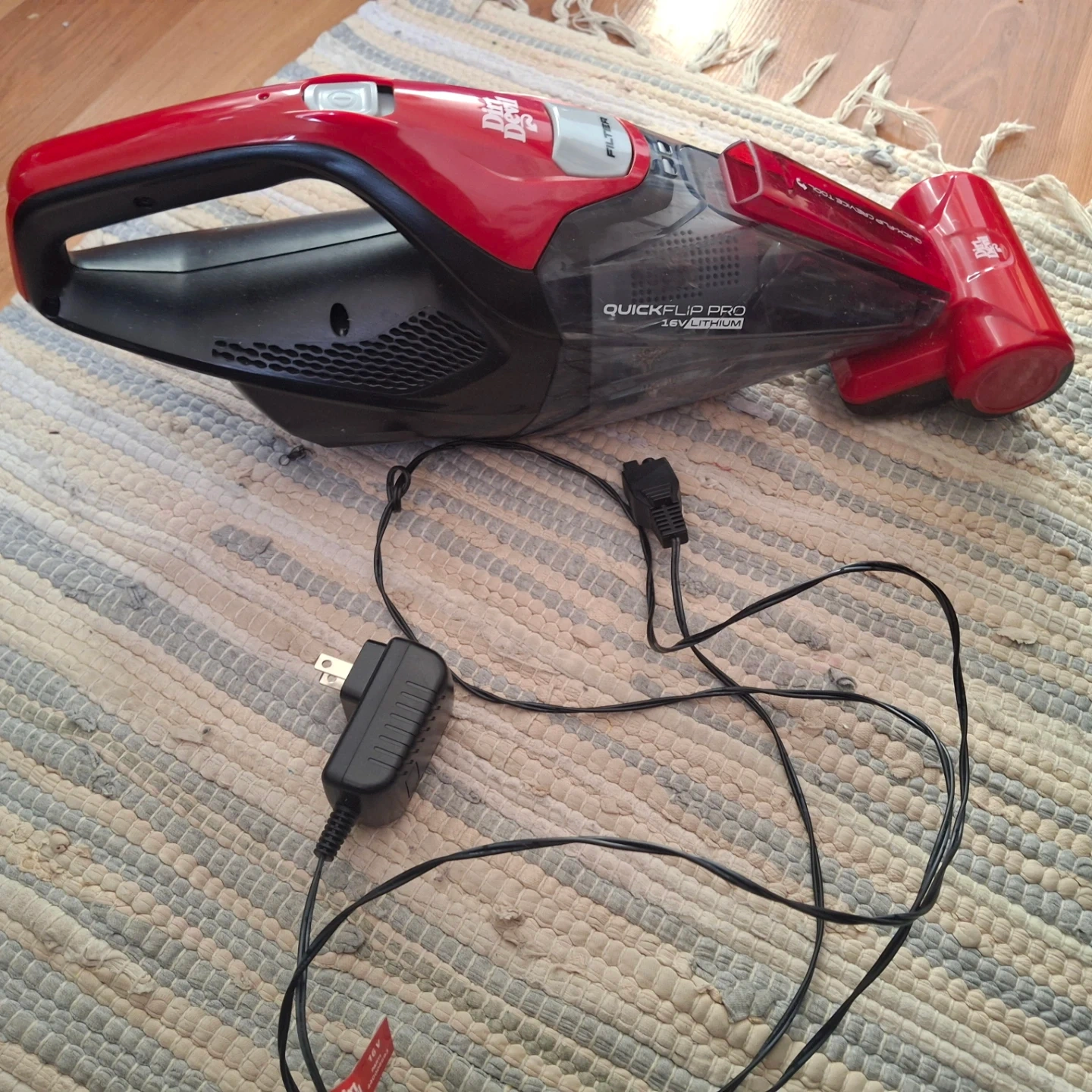 Red Dirt Devil QuickFlip Pro handheld vacuum. It's a 16V lithium model . Includes charging adapter