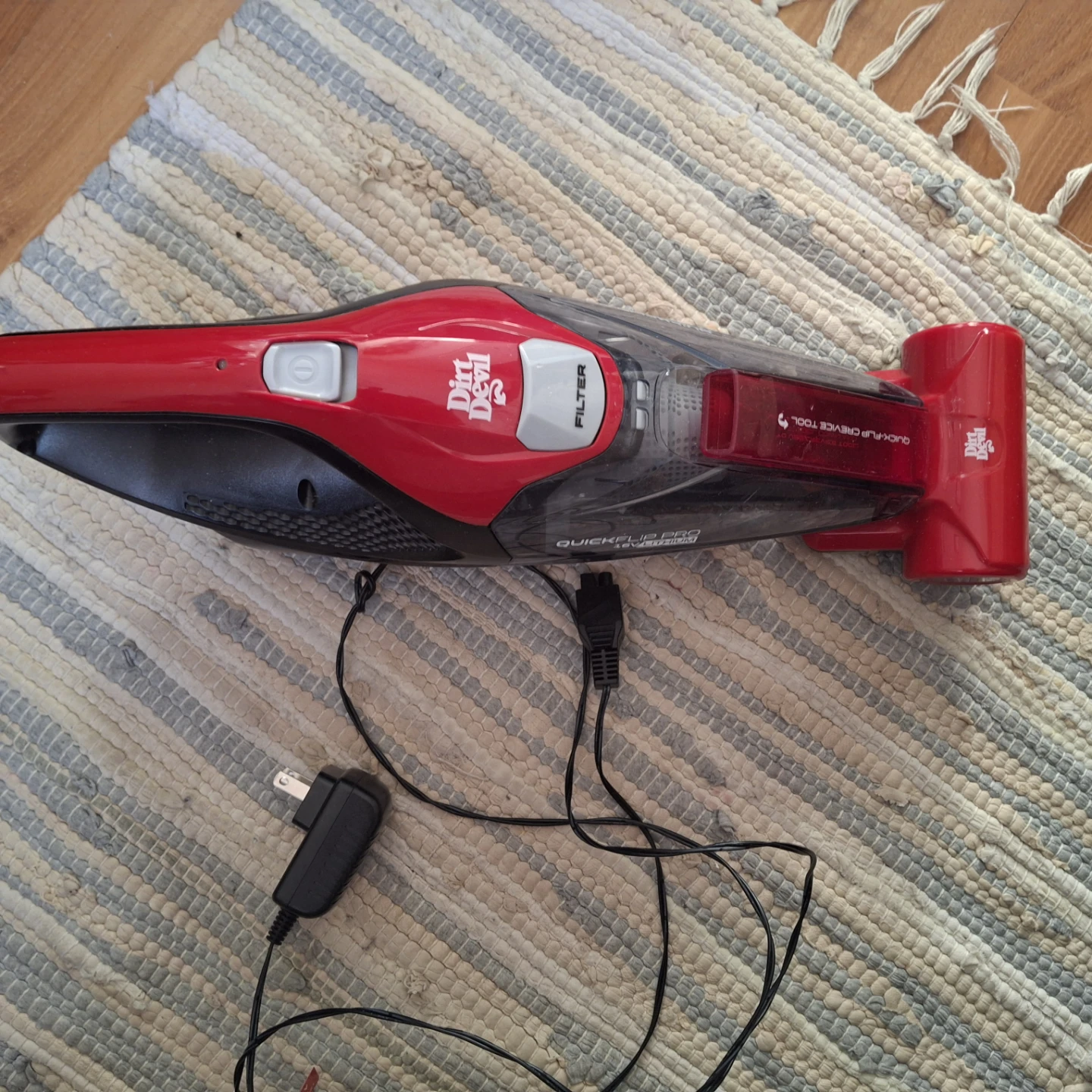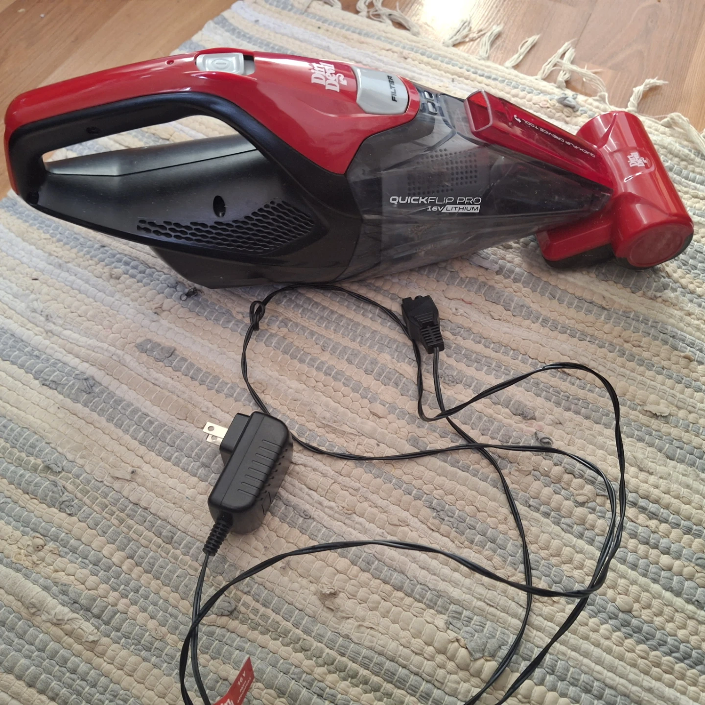 Red Dirt Devil QuickFlip Pro handheld vacuum. It's a 16V lithium model . Includes charging adapter