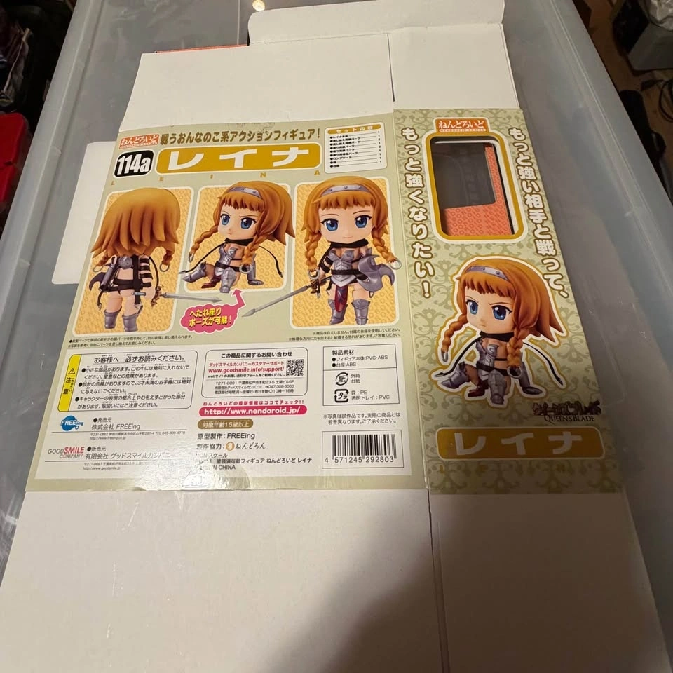 This is a Nendoroid figure of Reina from the Queens Blade series. It comes with the original box, but the inner plastic packaging is missing. The box has been flattened.