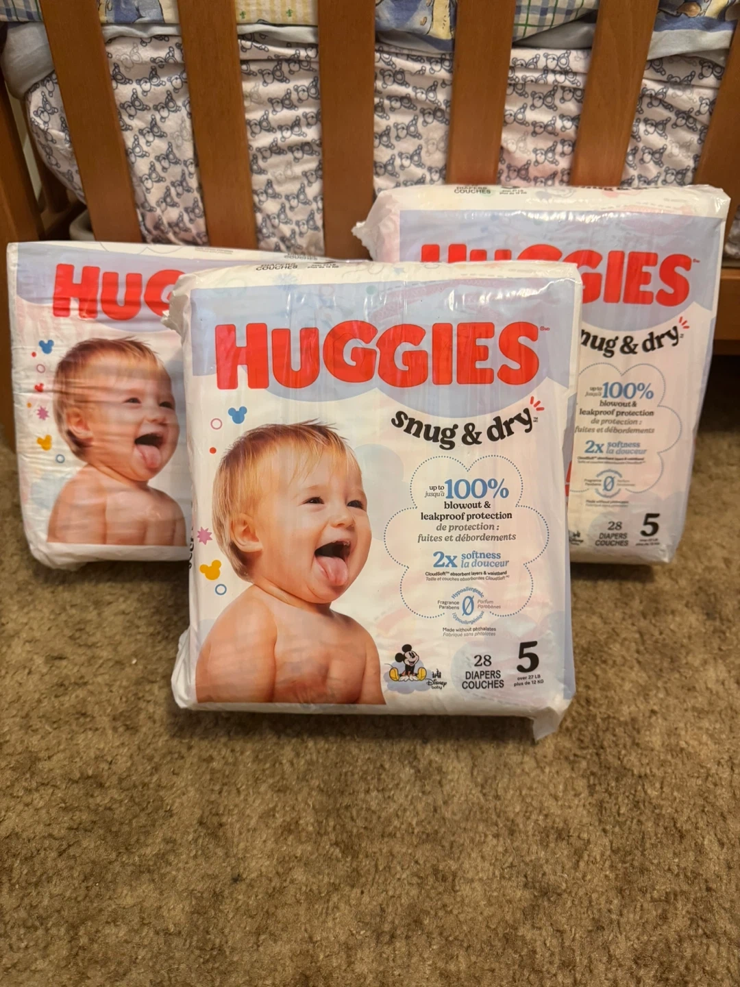 Selling 3 unopened packs of Huggies Snug & Dry diapers. Great deal for anyone with little ones in size 5!