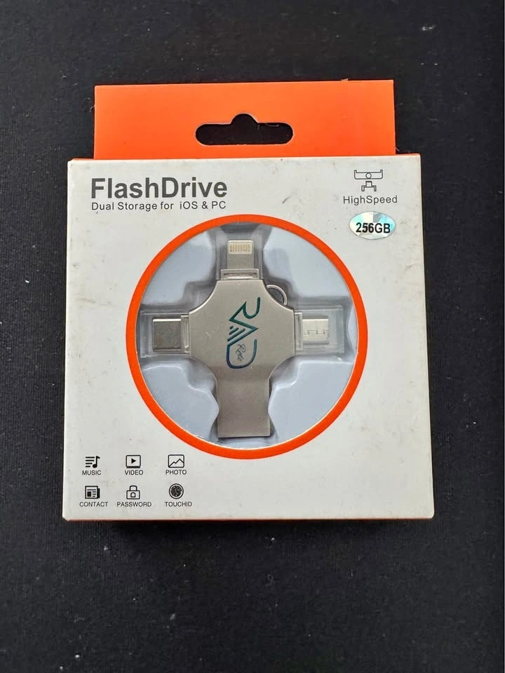 New RAD FlashDrive, 256GB storage. Useful for both iOS and PC. High-speed data transfer. Can store music, videos, photos, contacts, and passwords. Still in box.