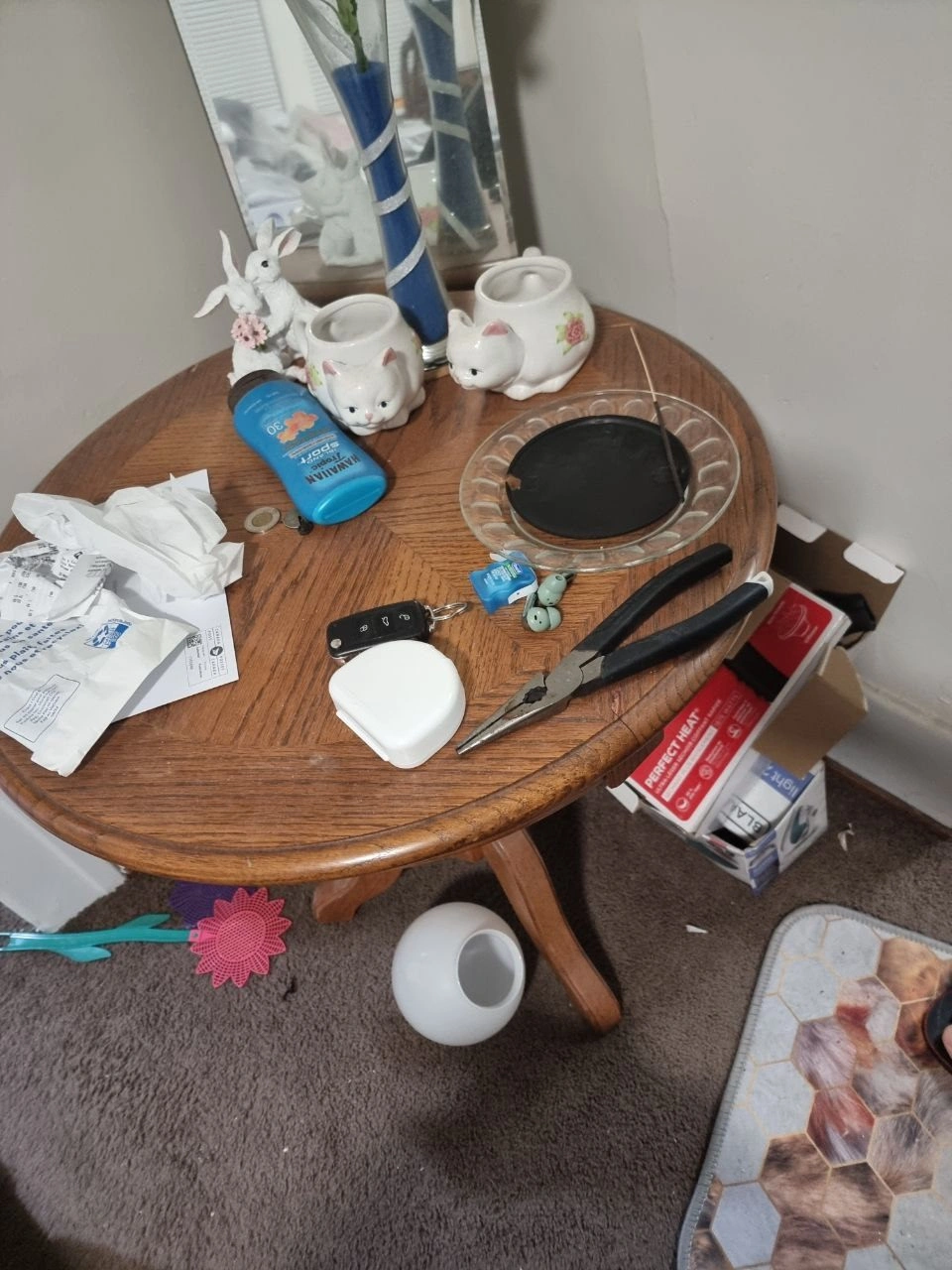 Selling a matching set of 3 living room tables. Includes one large oval coffee table and two round side tables.