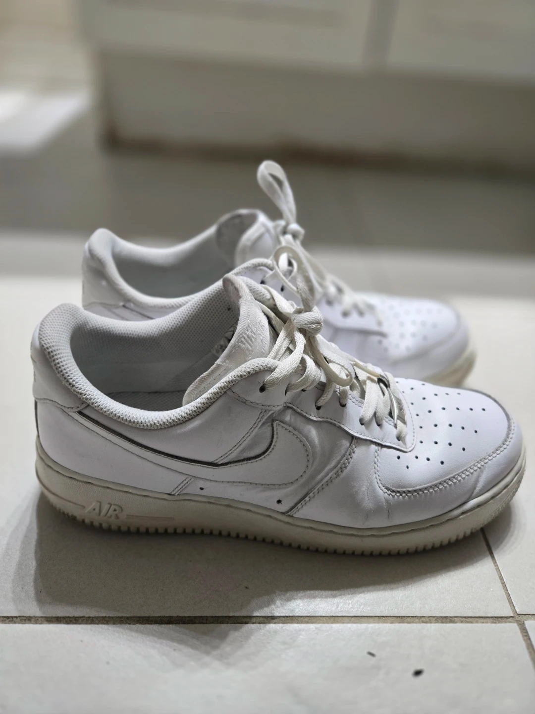 Classic white Nike Air Force 1 Low sneakers. Leather upper with lace-up closure. Iconic design for everyday wear. Shows some signs of use.