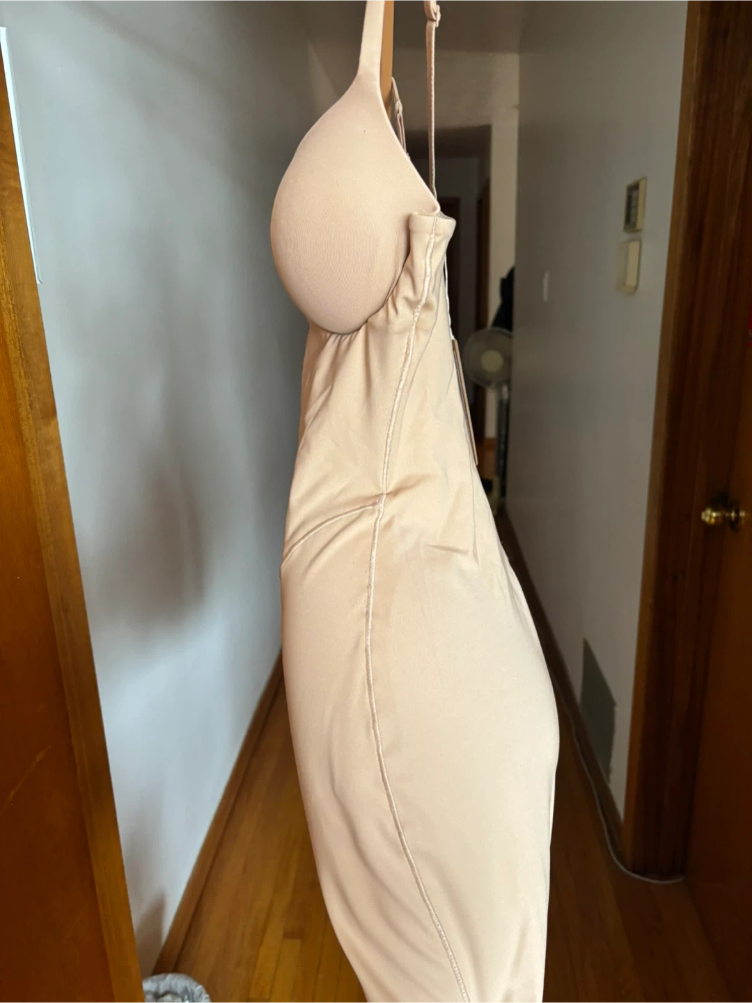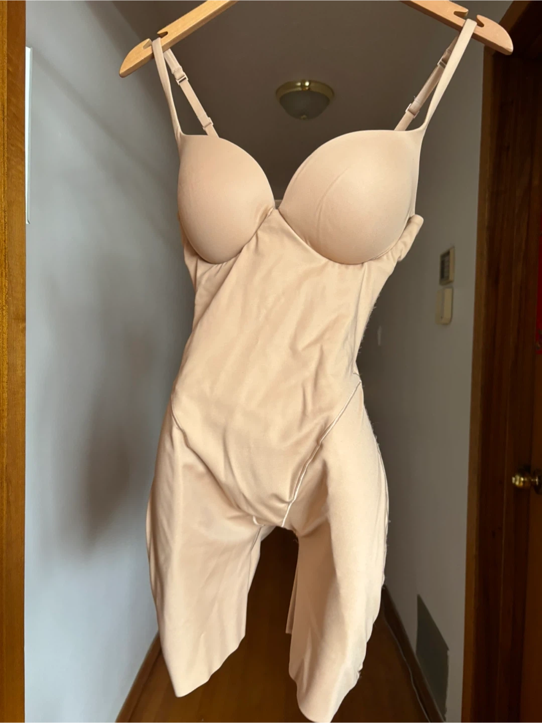 SKIMS sculpting bodysuit: push-up enhancing padded mid thigh bodysuit. It has adjustable straps and a built-in bra. Made with a comfortable, stretchy material for a smooth finish.